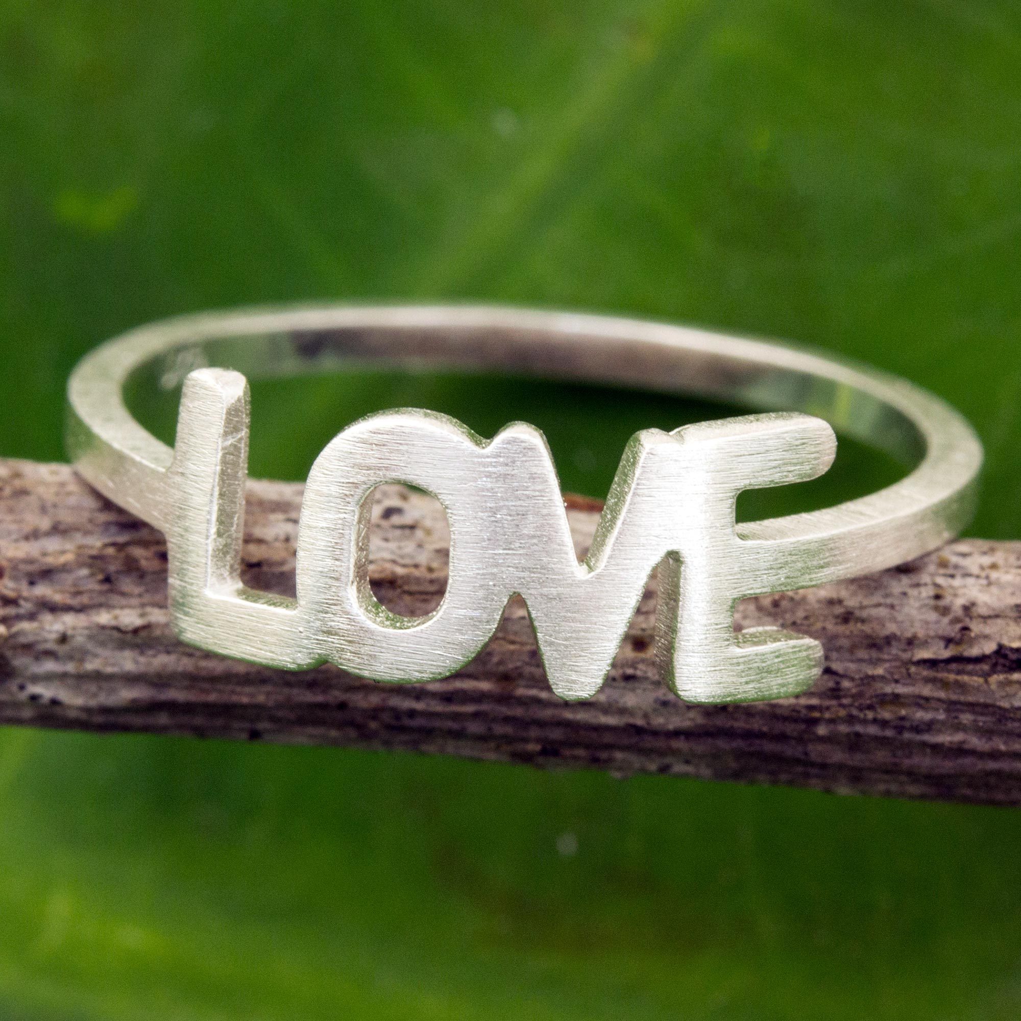 Crafted by hand, this delightful ring reads "LOVE." Jantana in Thailand works in brushed sterling silver to create the modern band ring.