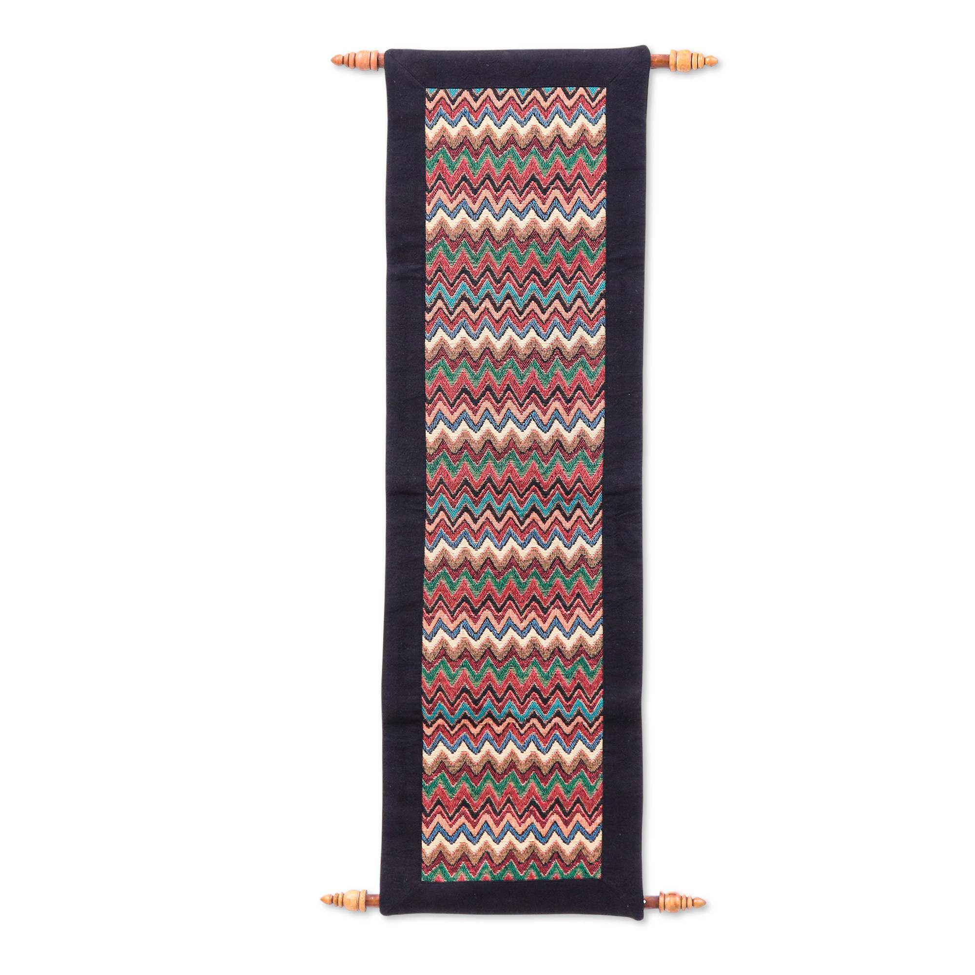 Naga waves arrive from Thailand to tell a tale of tradition and wondrous artistry. Presented by Keawpankanlaya and crafted by master artisans, this cotton wall hanging combines bright hues in several zig-zag waves, handwoven with classic techniques. Black edges and raintree wood rods complete the piece, whereas a handy cotton cord allows easy setting.