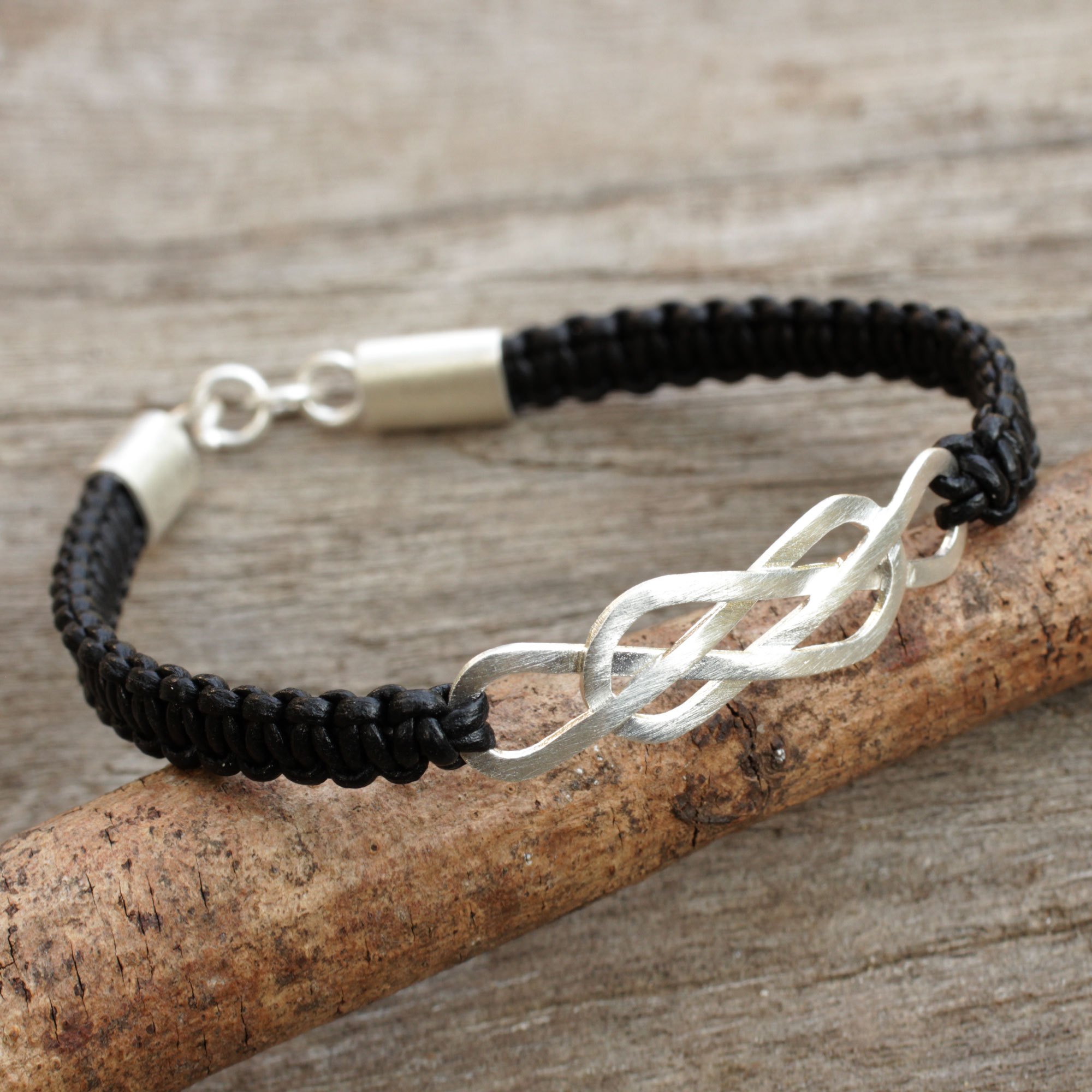 In brushed satin sterling silver, interlocking lemniscates, or infinity symbols, center this bracelet from Thailand. Sarote Lochotinunt knots the brushed satin pendant to black leather as he crafts the bracelet by hand with macrame techniques.