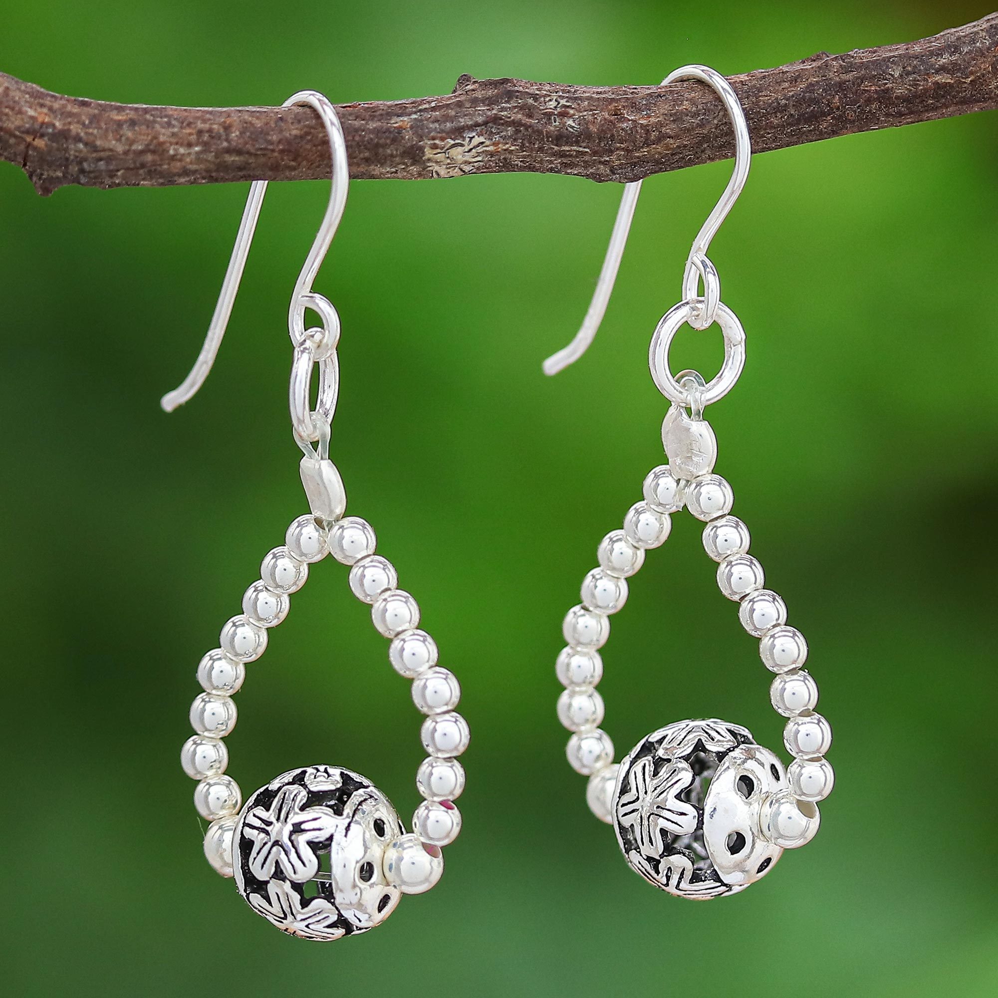 Hand crafted with an oxidized floral motif, Samart Takham's shimmering dangle earrings are an elegant choice. The Thai artisan centers each earring with a sterling silver bead she carefully engraves with stylized flowers. The bead swings from the bottom of a sterling silver-beaded loop and matching sterling silver hooks.