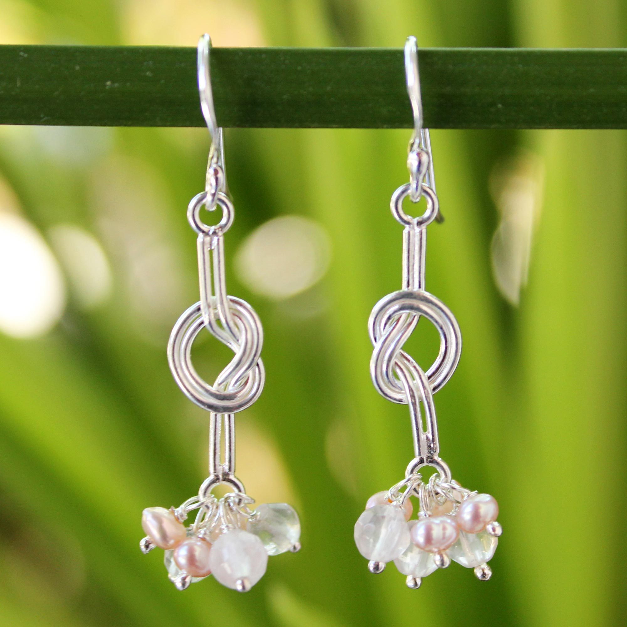 Representing love and romance, pink pearls and rose quartz cluster at the end of love knots from Thailand. Withaya Cheunjit presents these fabulous earrings which are crafted by hand with sterling silver.