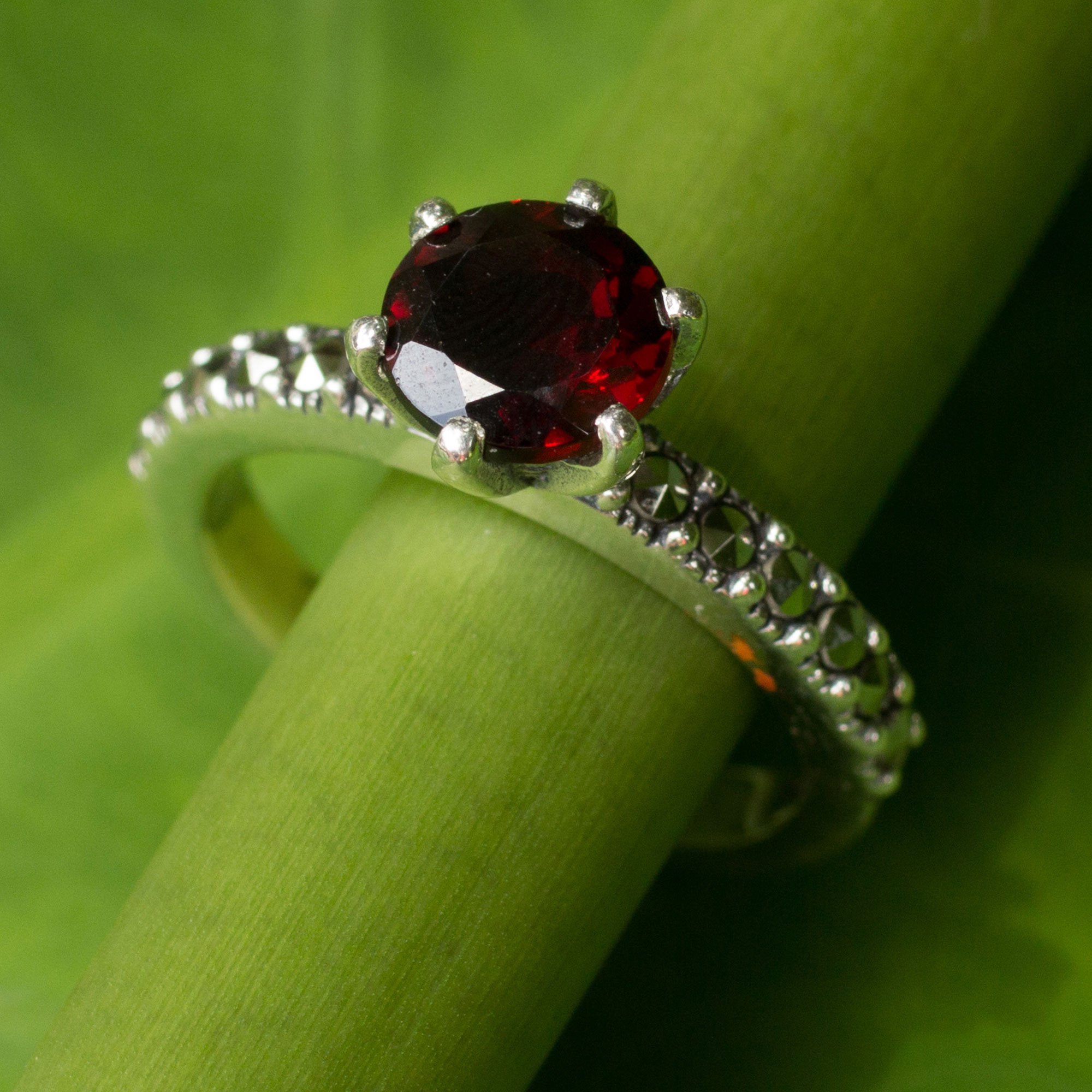 Symbol of passion and love, a faceted 1.5-carat garnet, the birthstone of January, centers a silver band set with sparkling marcasite. This elegant ring by Narinee is lovingly handcrafted in Thailand of sterling silver.