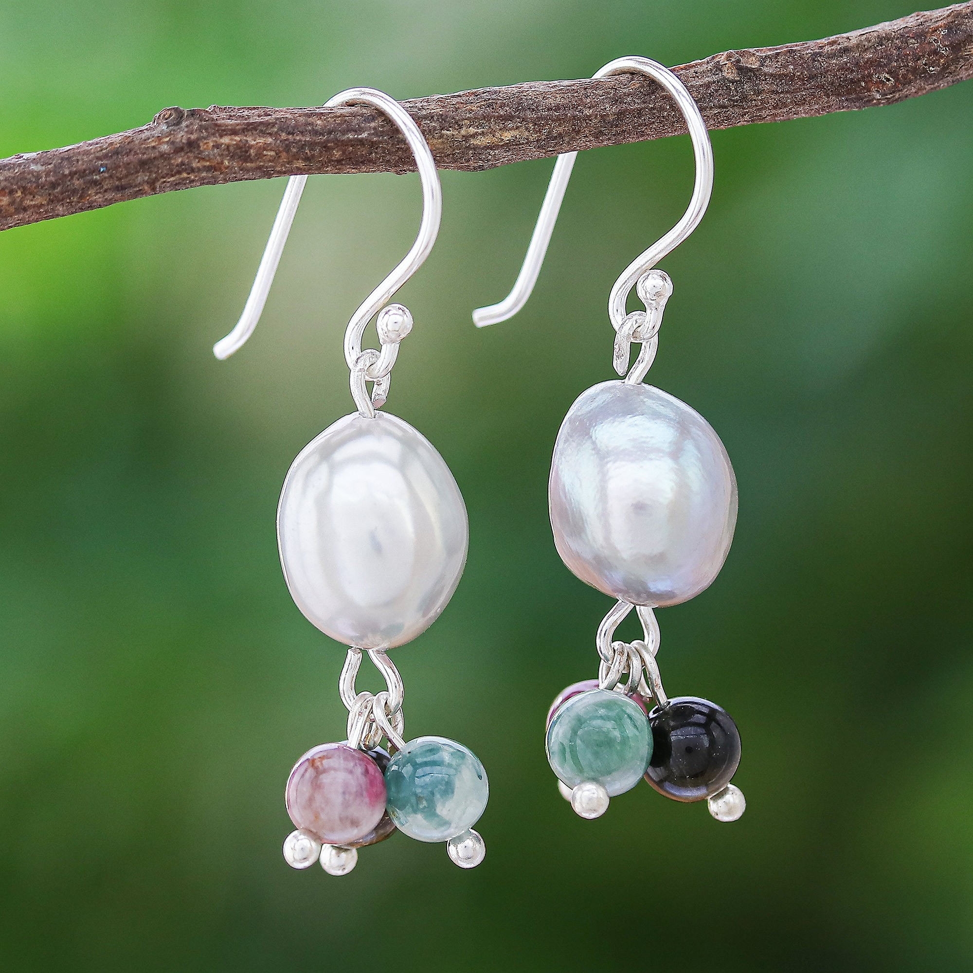 Crafted with large pearls, Matta's lovely dangle earrings are a sweet reminder of the sea. The Thai artisan centers each earring with a cultured freshwater pearl before suspending a trio of tourmaline beads from the glowing gem. Sterling silver hooks and accents add shimmering details.
