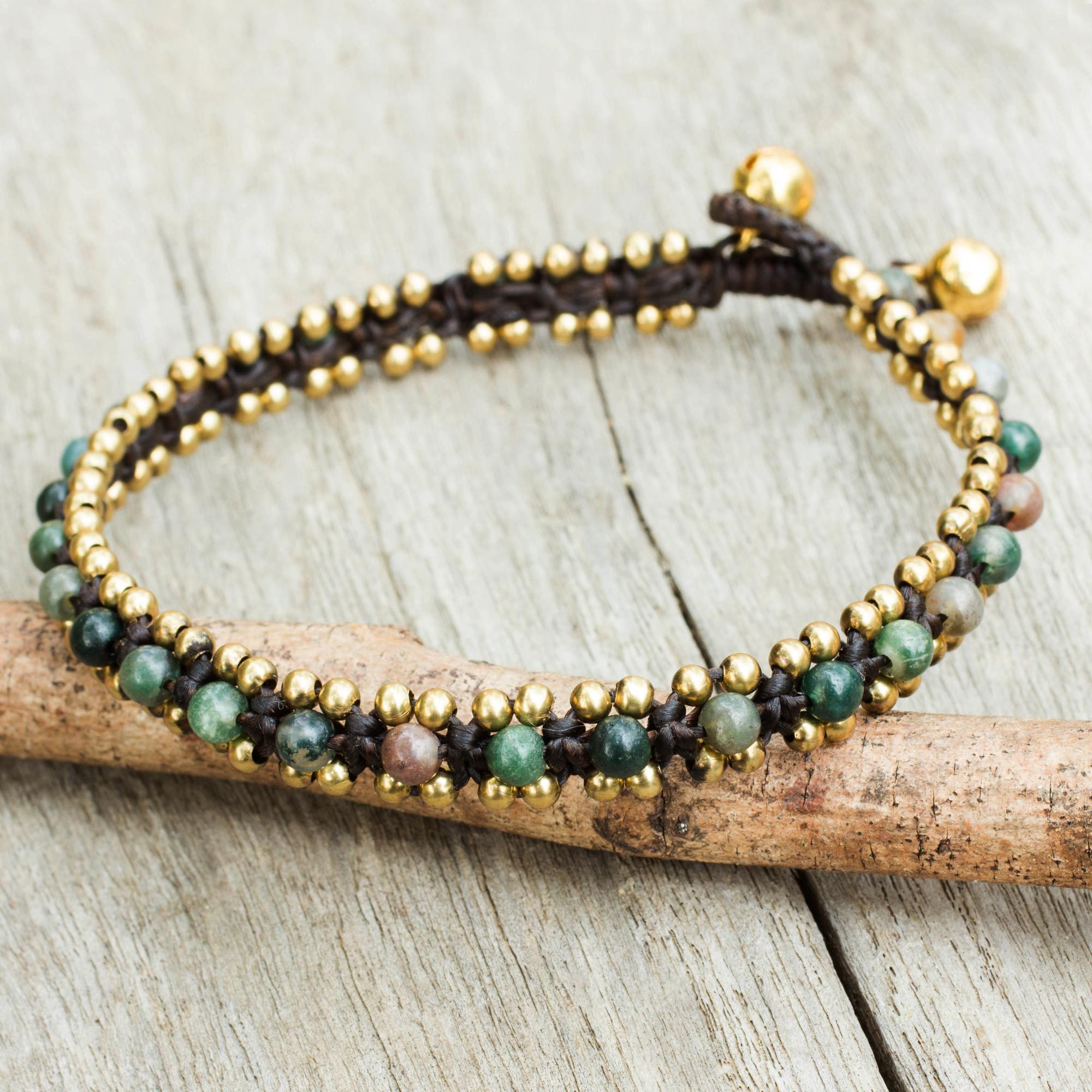 Thailand Crocheted Agate Anklet with Brass Beads and Bells, 'Tinkling Bells'