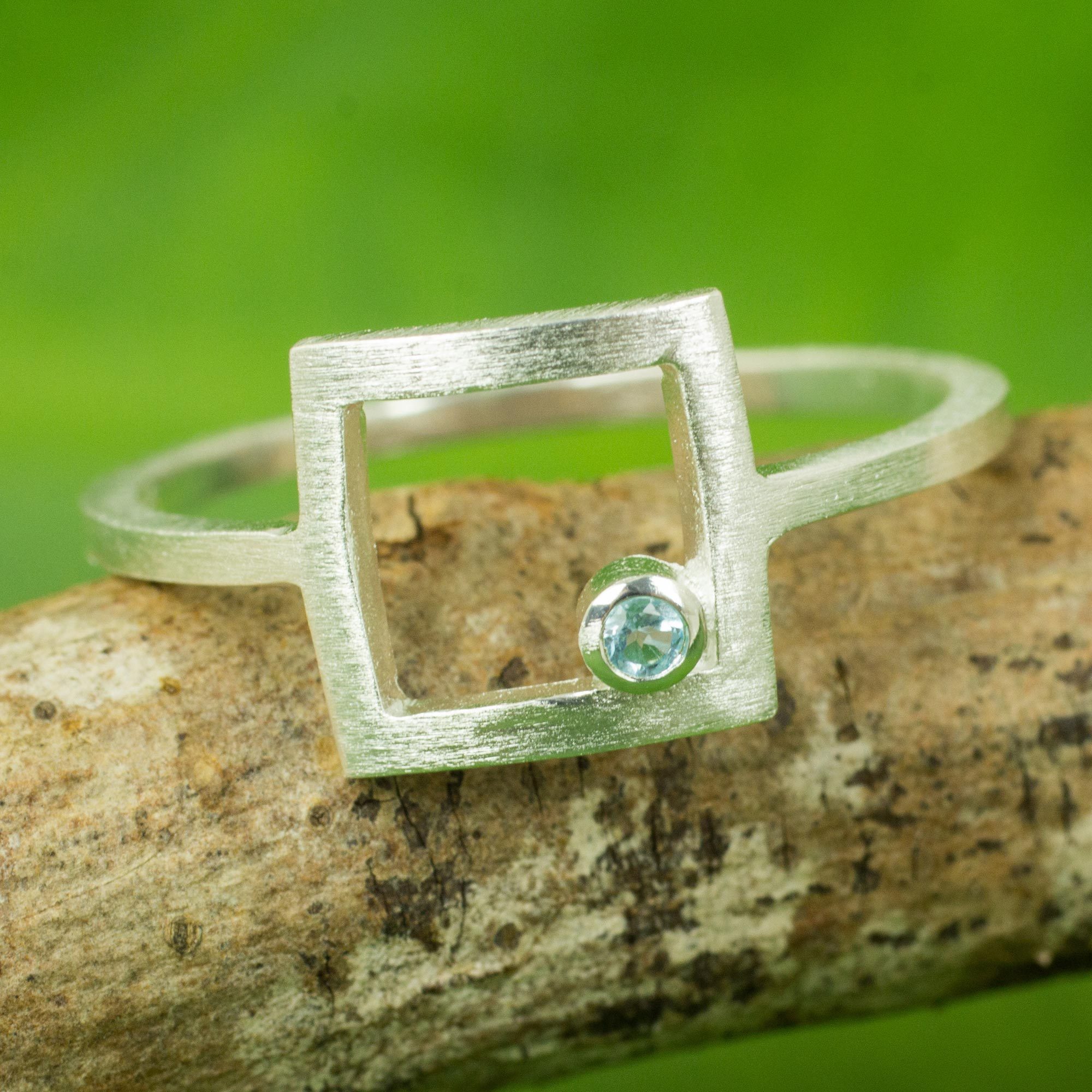 Faceted blue topaz draws the eye to an open window, inviting the soul to look outside. Working in sterling silver with an enchanting brushed finish, Jantana in Thailand crafts this original ring.