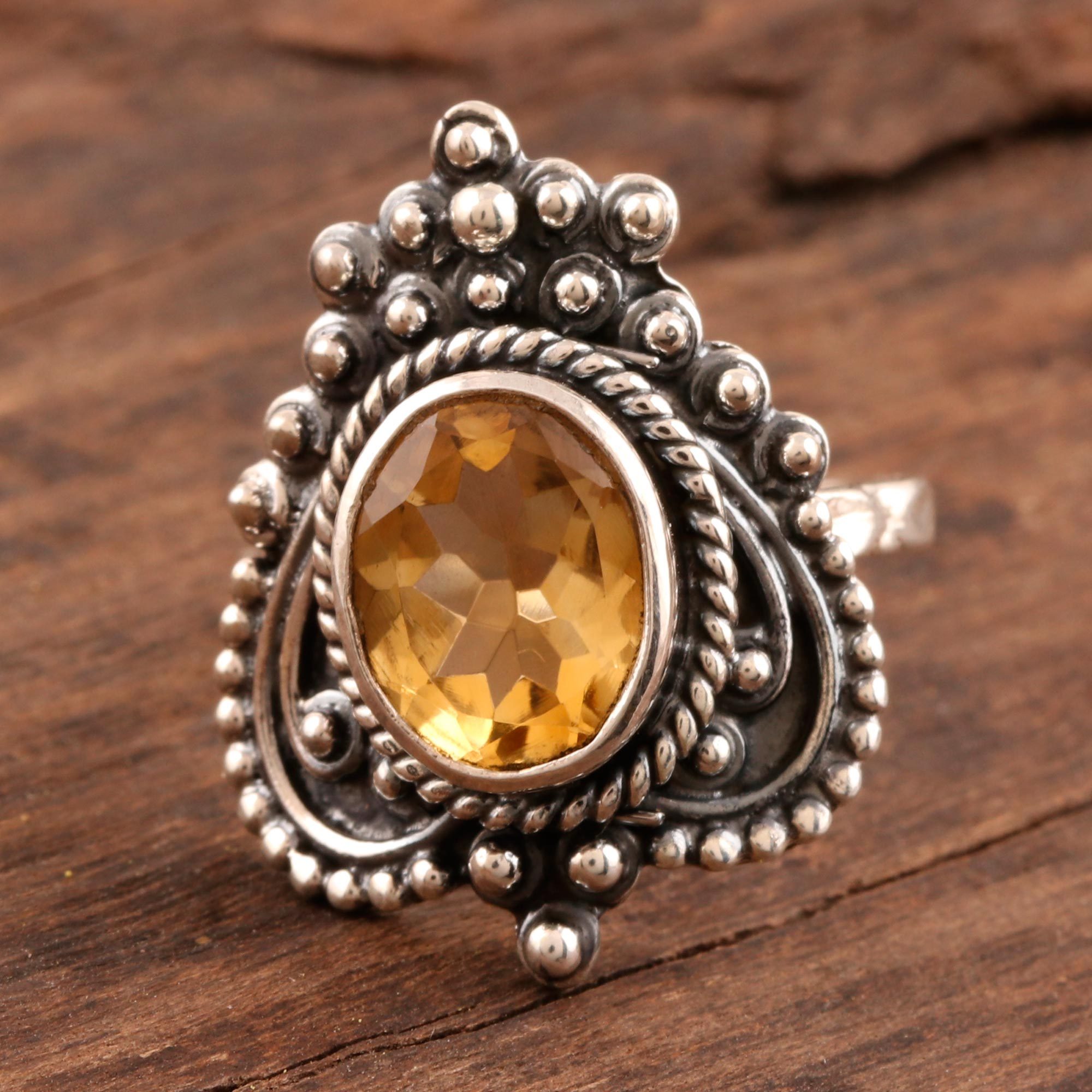 Three carats of golden citrine distinguish this cocktail ring from Pawanesh Gupta in India. The sparkling stone is set in sterling silver, and lavishly embellished with beaded details and rope motifs. The heart-shaped crown centers a subtly-textured sterling silver band.
