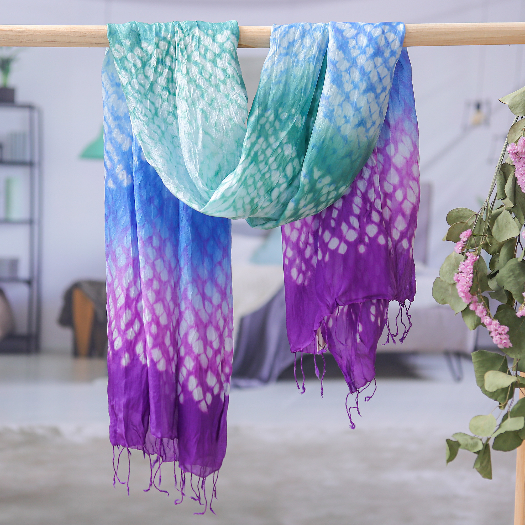 This captivating scarf, featuring striking patterns and vivid shades, is crafted using authentic tie-dye batik techniques. Designed by Thai artisan Vinita, it blends rayon and silk for a soft, luxurious feel and is finished with delicate fringes, perfect for adding a splash of color to any outfit.