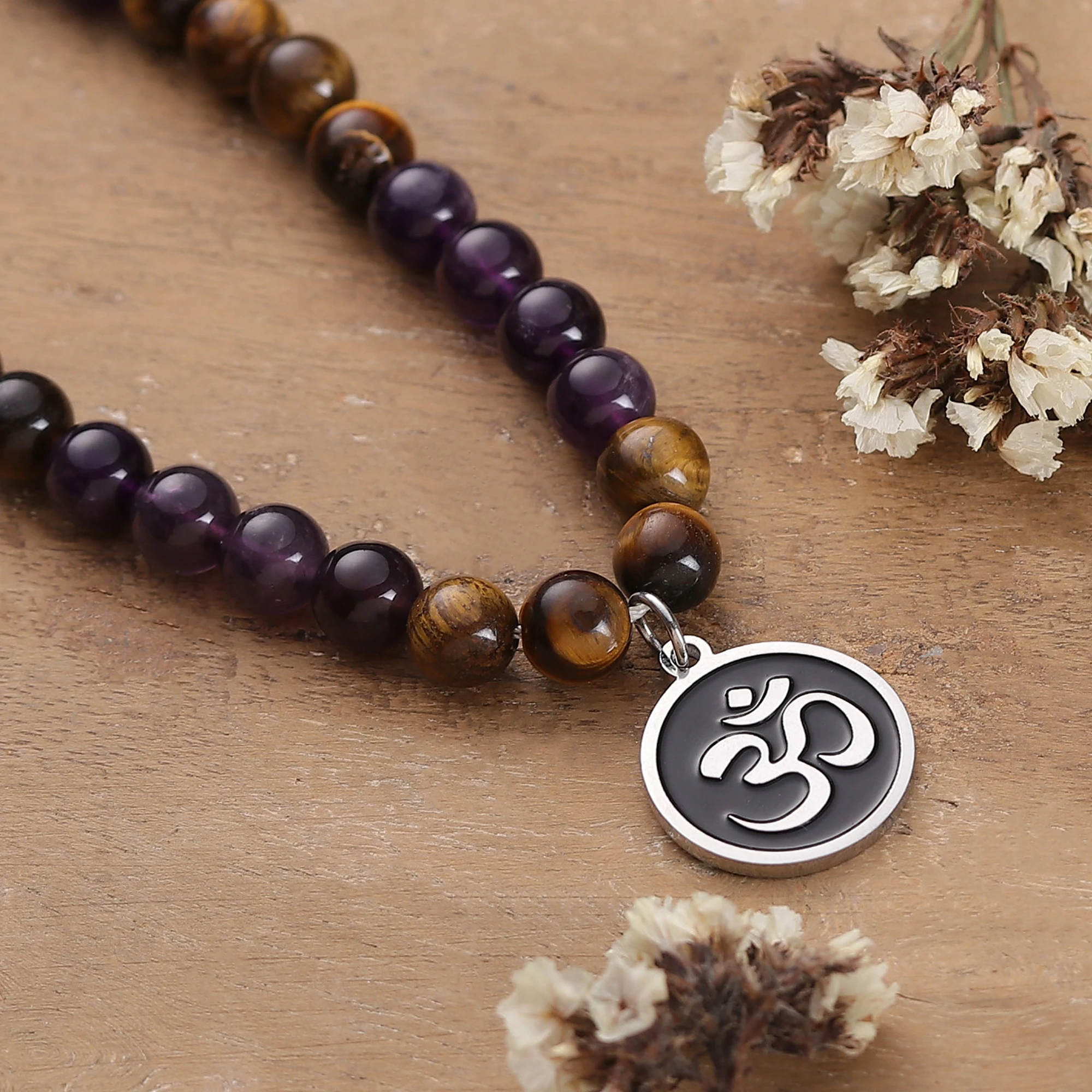 Embrace grounding and spiritual balance with this lovely pendant necklace by Indian designer Sumit Dhawan. It showcases an array of tiger's eye beads for confidence and protection, and amethyst stones for clarity and peace. The necklace is adorned with a stainless steel pendant featuring the Om symbol, representing universal consciousness.