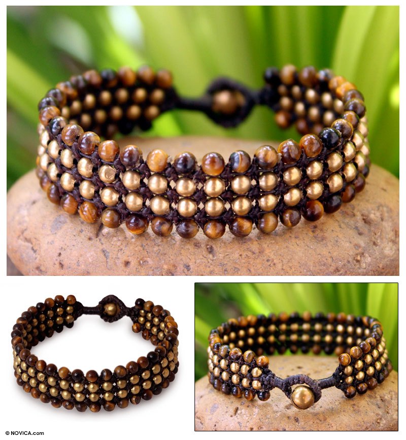 Thailand's Tiraphan Hasub finds inspiration in tribal fashions for the design of this wristband. Crocheted by hand, the bracelet has tiger's eye flanking shiny brass beads in a design underscored by warm golden hues. The clasp is shaped from a hollow brass bead.