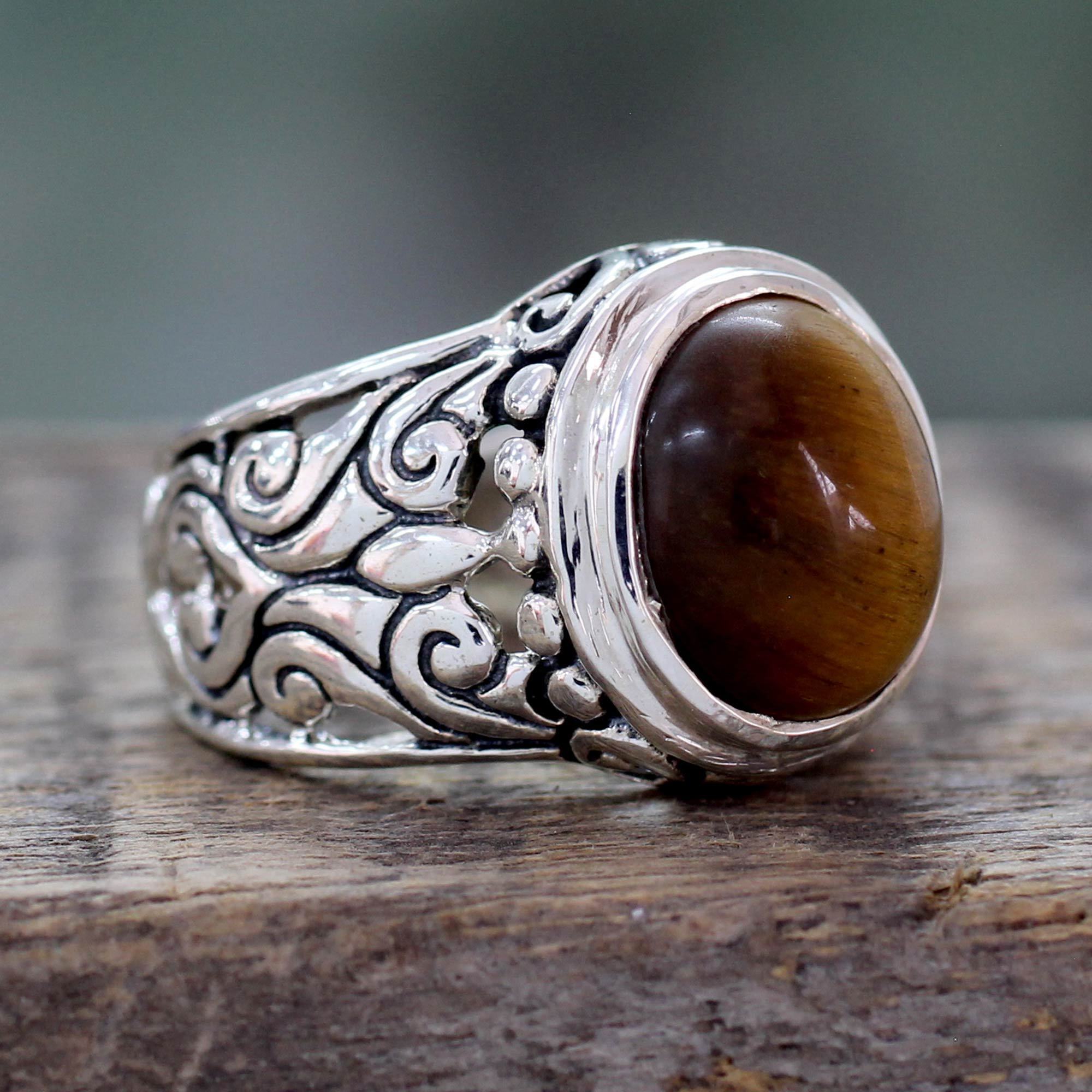 Let earthy tiger's eye bring you focus and clarity. This impressive sterling silver ring presented by Chintan features a stylized leafy motif with a single tiger's eye gemstone.