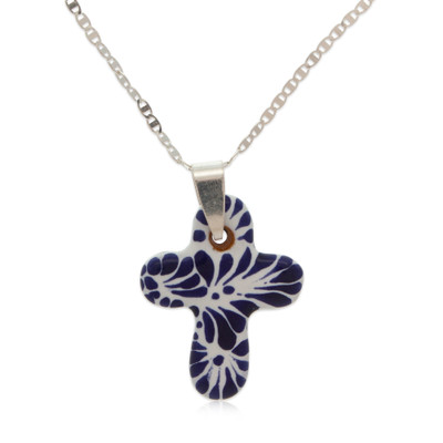 Hopeful blue and white merge with the Talavera art style in this pendant necklace by Monica Vazquez. Crafted in Mexico, the necklace takes you on a Hacienda adventure with floral details and a classic cross pendant dangling from a sterling silver chain, symbolizing your indomitable hope.