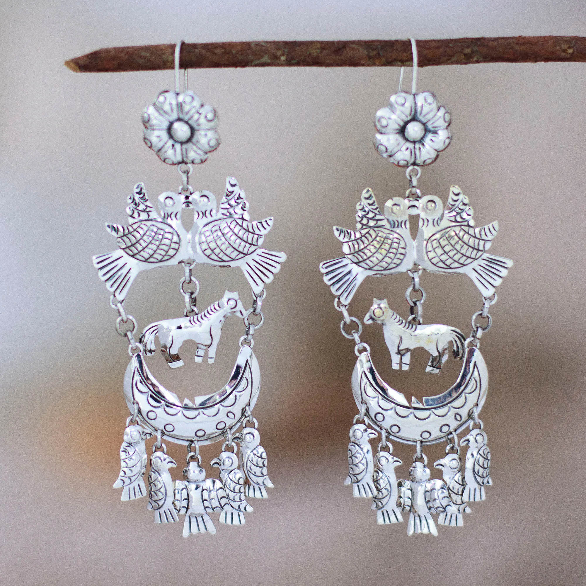 Mexico's splendor forms a heavenly scene inspired by traditions and customs. Artisan Roy Nilson works with sterling silver and the classic Taxco silversmith to create these majestic chandelier earrings featuring bird, floral and horse motifs that form a unique celestial scene, which also adds a glimpse of Mexico's elegance to your ensembles.