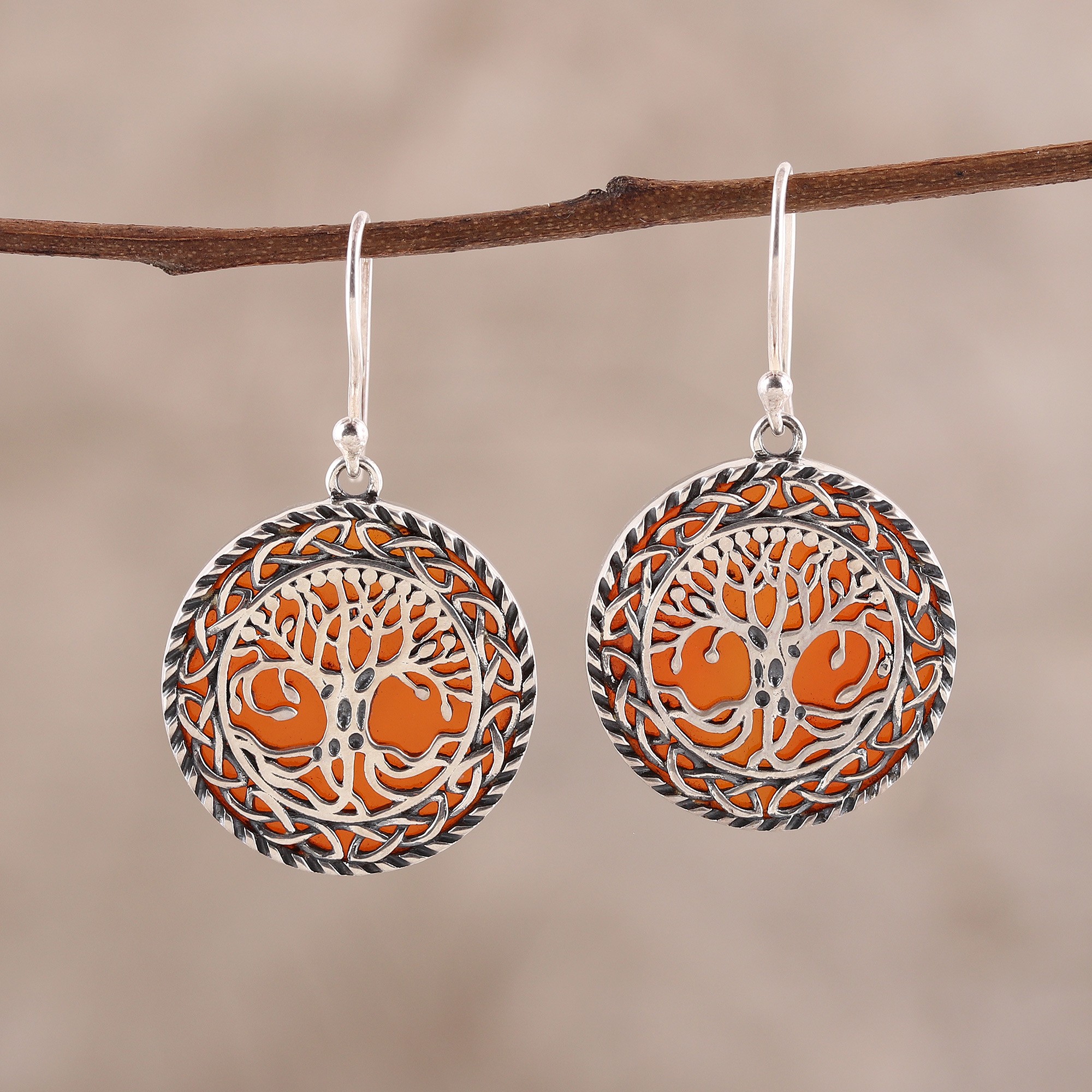 Crafted from sterling silver, the roots and boughs of two trees give way to reveal the fiery beauty of carnelian. Alok Jain presents these circular dangle earrings from India, adding a touch of grandeur to any outfit.