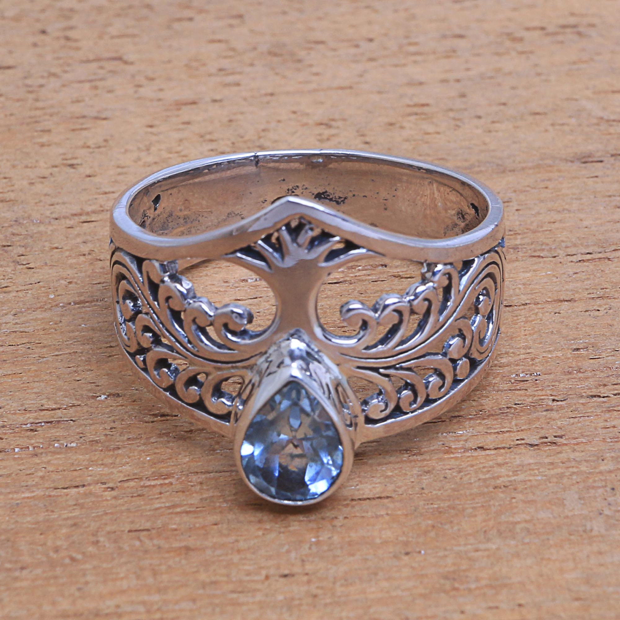 Crafted of sterling silver with lovely openwork, a majestic tree decorates the front of this cocktail ring from Bali. Asmara Putra designs this shining ring, which features a one-carat teardrop of sparkling blue topaz.