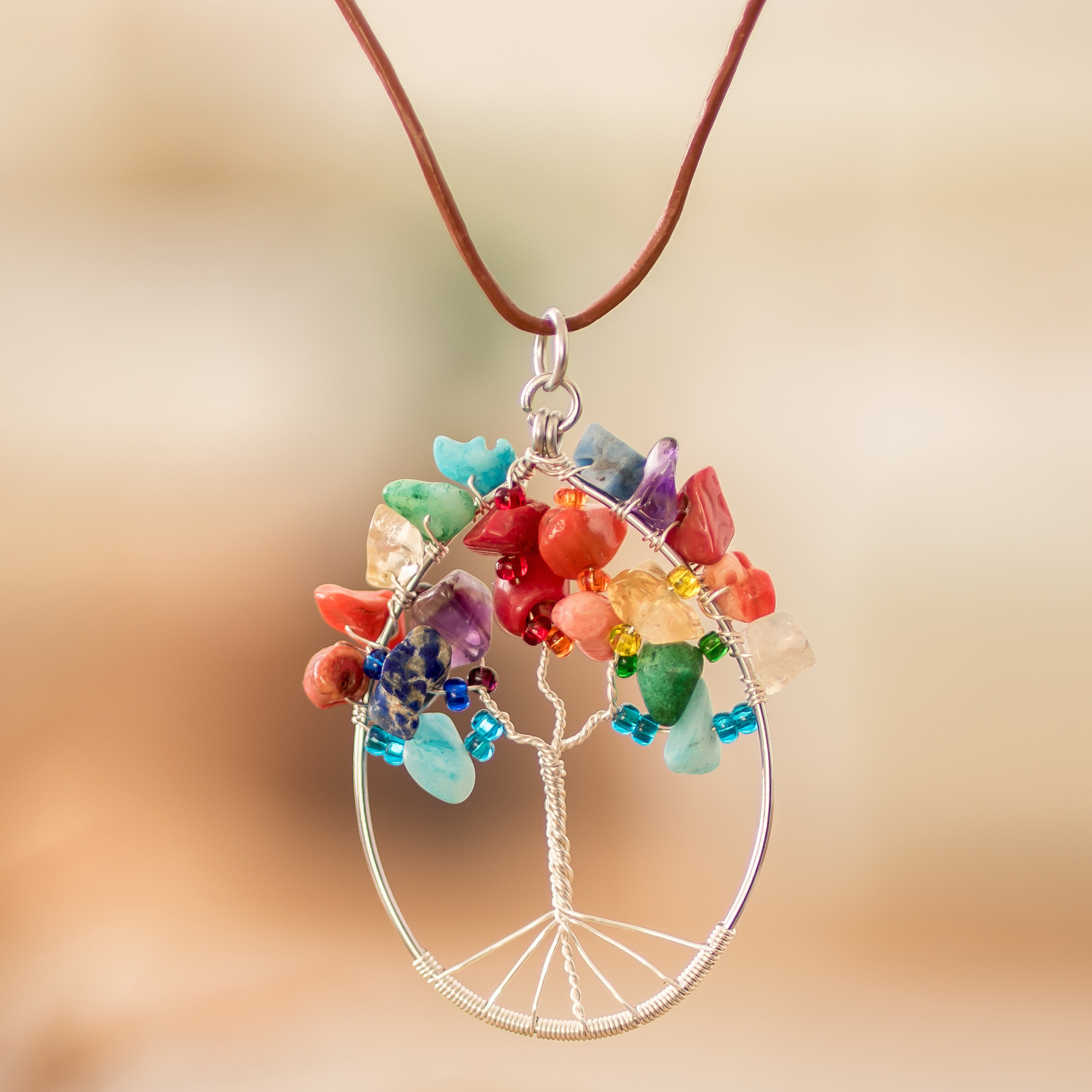 Wondrous rainbow leaves grow with magical beauty at the bottom of this creation by Domingo Reanda of Guatemala. The artisan—an expert in classic jewelry pieces with a touch of enchantment—achieves a tree illusion thanks to an outstanding work made from stainless steel wires in colorful shades, forming an oval pendant that dangles from an adjustable leather cord necklace. The tree boasts jasper, citrine, amethyst, quartz, glass beads and crystals, enriching the design's glorious look.