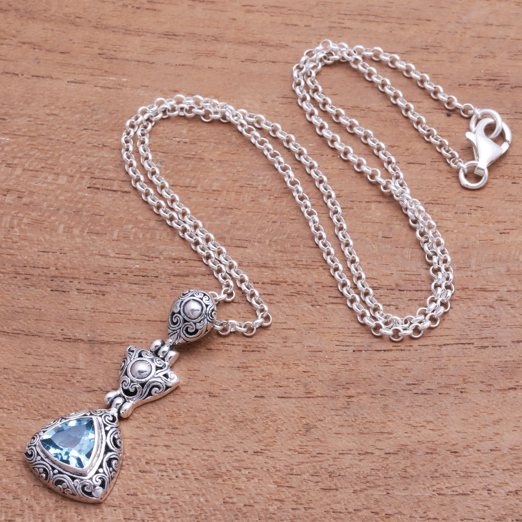 Surrounded by intricate swirl patterns in sterling silver, a trillion-cut gemstone of blue topaz weighs over three carats. Balinese artisan Ni Wayan Astiti creates this pendant necklace.
