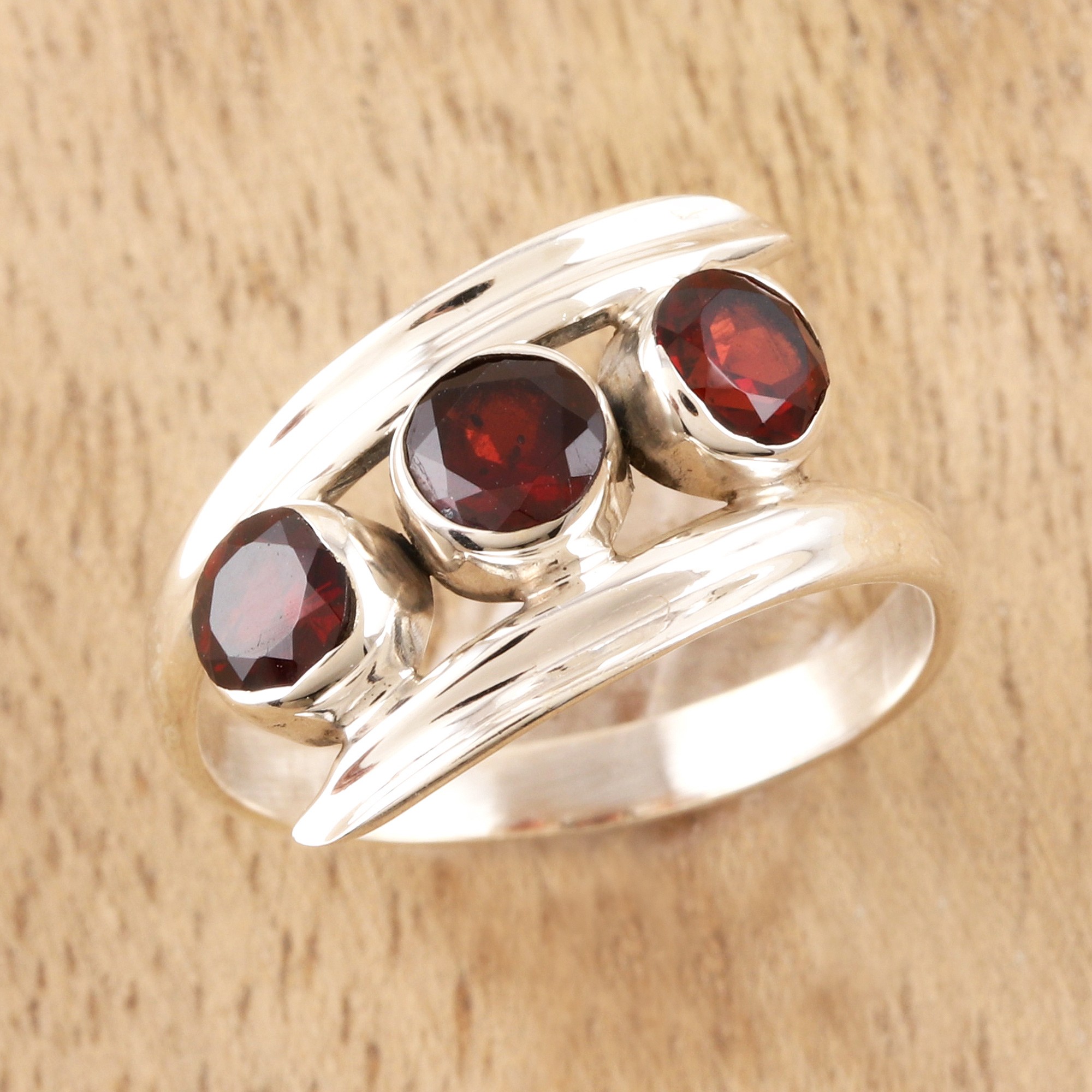 Showcasing three round-cut garnet gems, this ring from Rakesh Rana in India will capture admiring glances. The gems are set in polished sterling silver between both ends of a slender, shapely band.