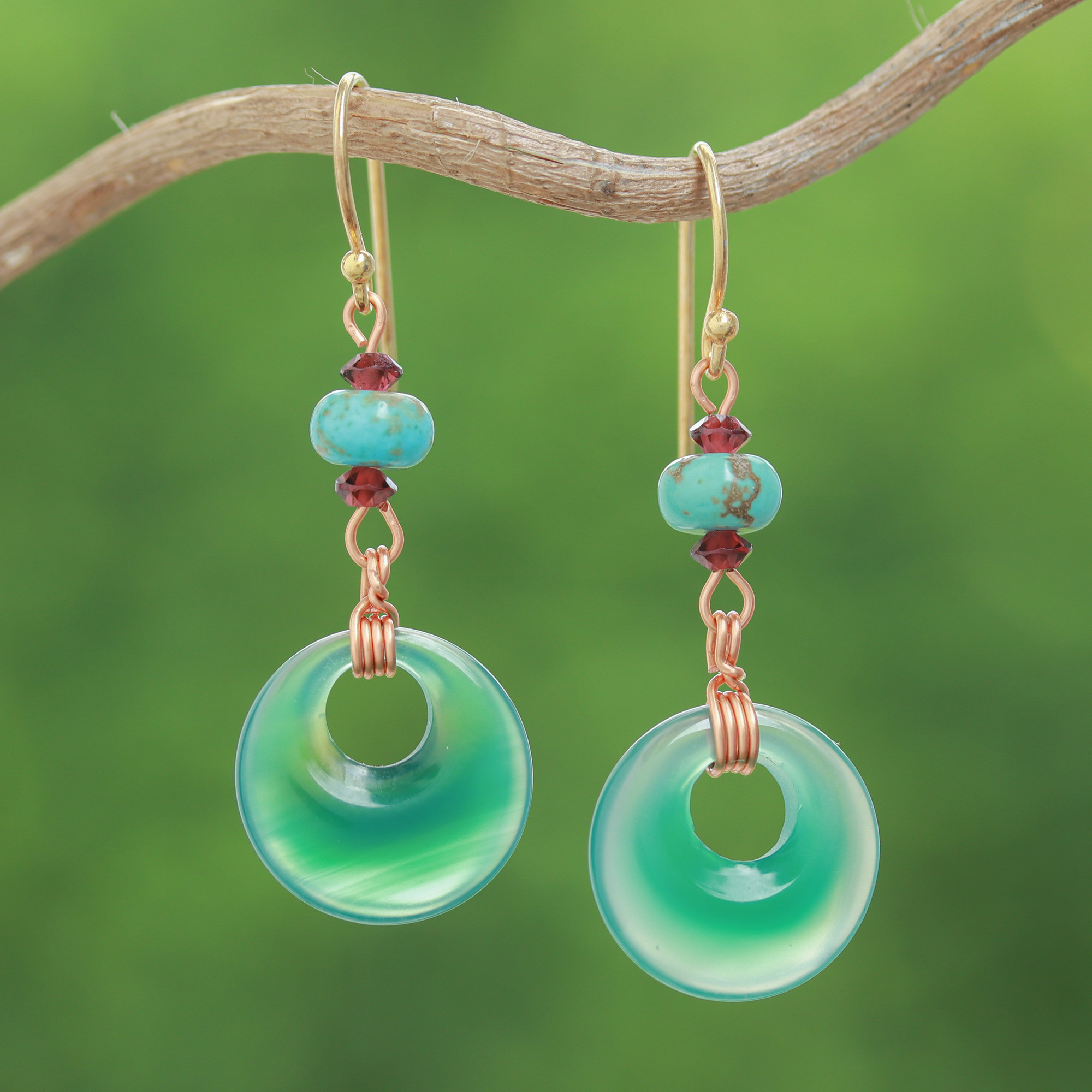 The colors of a paradisial island merge in these luxurious dangle earrings from Thailand. Artisan Somluck Komolmith represents the colors through green onyx, reconstituted turquoise and garnet gems, beautifully arranged on a copper structure that dangles from brass-plated sterling silver hooks.