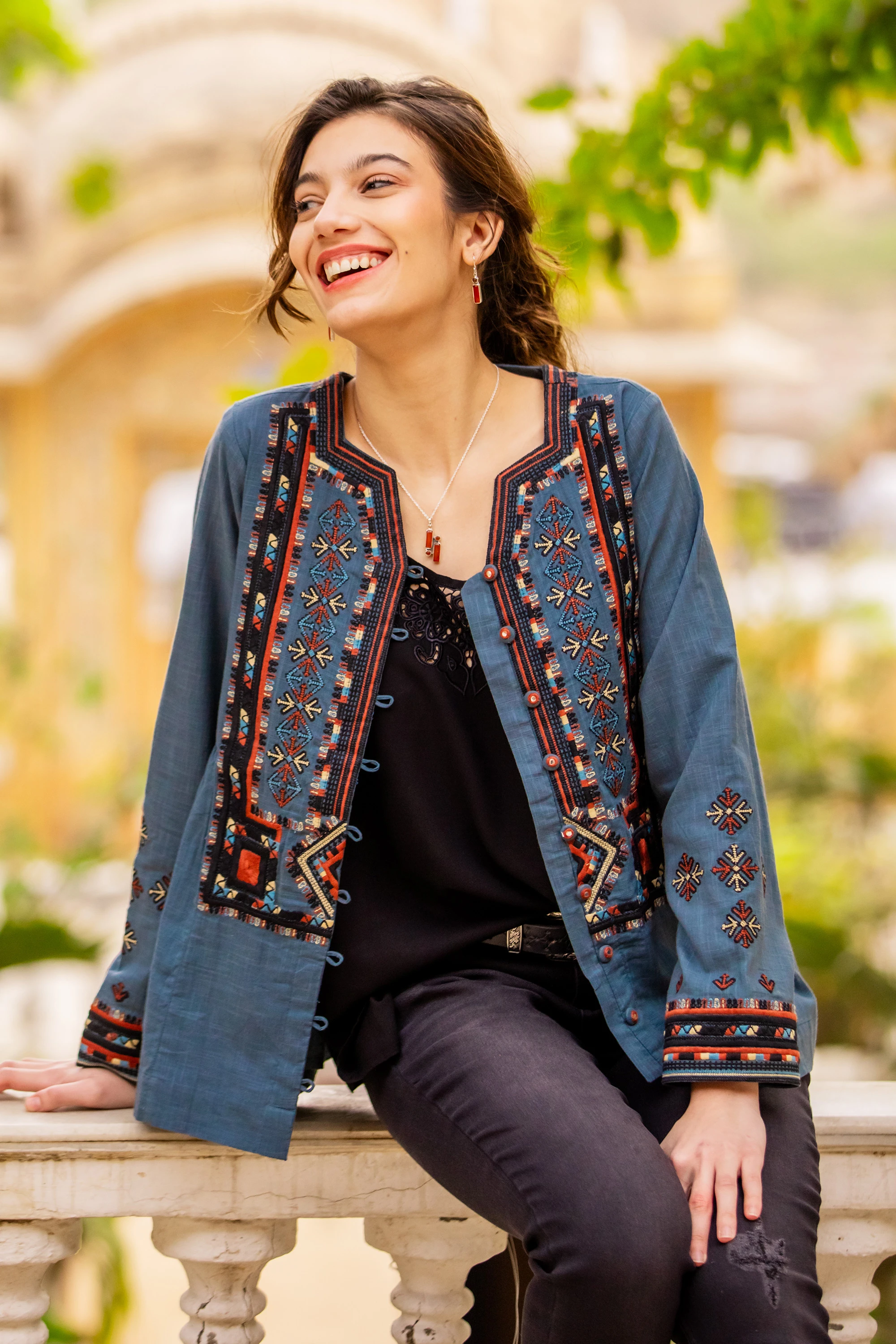 The unique architecture of the glorious City Palace in Jaipur inspired designer Seema Shah's cotton jacket. A comfortable and stylish layer, the jacket features a notched neckline, fabric covered buttons with loop closure and gentle gathers at the waist to give a flattering fit.