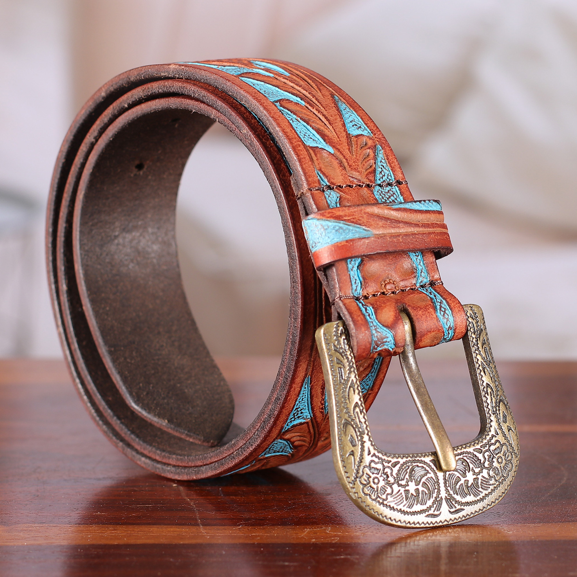 Turquoise and Copper-Toned Men's 100% Leather Buckle Belt, 'Vintage Appeal'