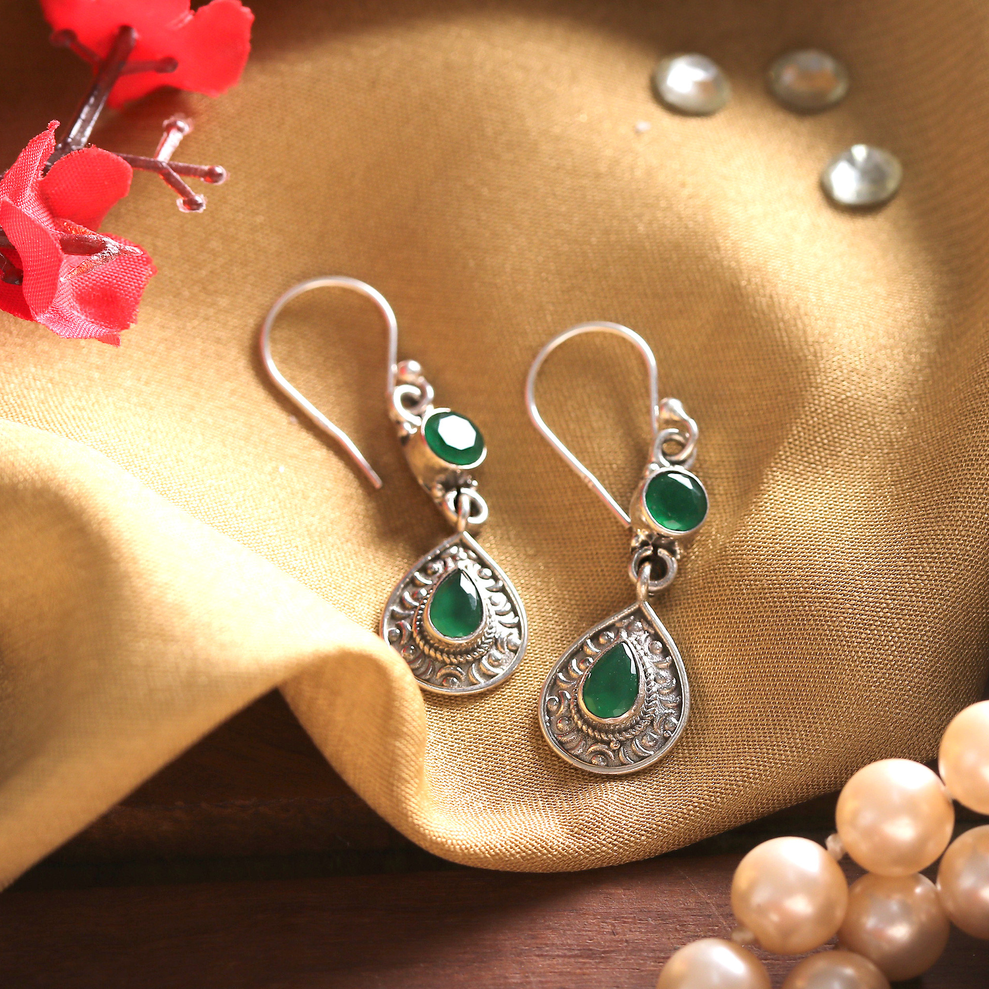 A sublime work of sterling silver makes these dangle earrings a distinguished example of India's high jewelry arts. Bhavya Jain crafts these dangle earrings from classic techniques, embellishing each drop-shaped piece with a combination of oxidized and polished finish. Emerald stones—totaling two carats—add green light, symbolizing prosperity.