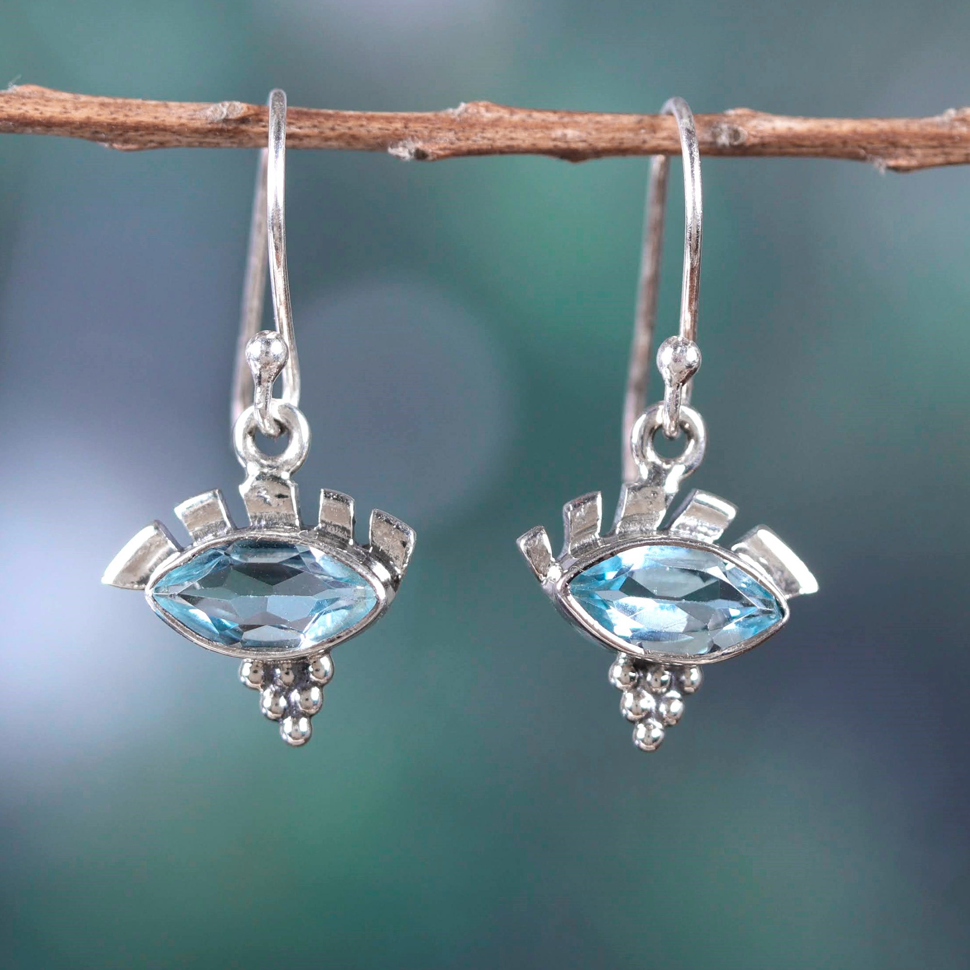 Let this heavenly stare capture your style and essence. Narayannii presents a gorgeous pair of sterling silver dangle earrings crafted by talented Indian artisans, whose advanced skills allow them to create the polished structure composing this breathtaking design. But the earring's celestial aura is not only present in their lustrous finish, as they also feature faceted blue topaz stones totaling two carats.