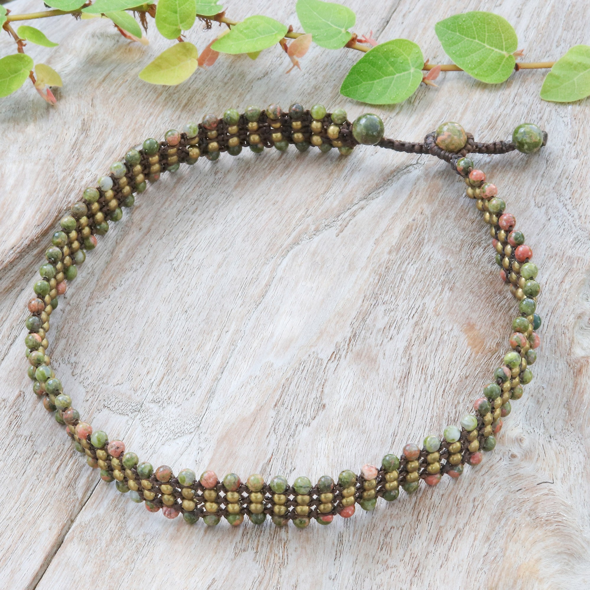 Combining a boho chic with a lovely elegant, Thai artisan Tiraphan Hasub designs and crafts this necklace. She handcrafts the necklace of polyester cord, beaded with gleaming brass that is flanked by natural unakite. This accessory is completed with an adjustable button clasp.