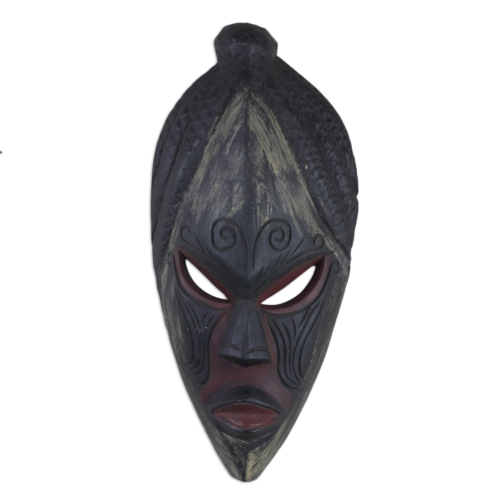Her beauty framed by braided hair tied in a chignon over her head, a woman's face is adorned with flowing artistry. Gordon Adu names his original creation Eye fe, the Akan term for beautiful. The stunning mask is carved by hand from sese wood and detailed with expressive artistry.