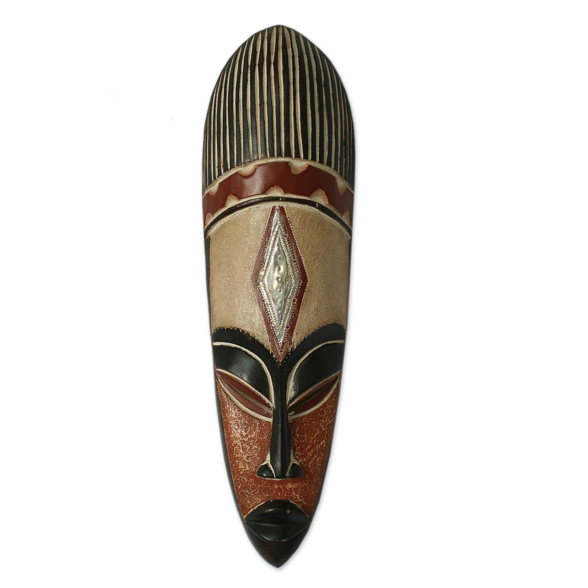 This serenely beautiful personage comes from the Gonja people of northern Ghana. Rich textures cover the symmetrical features, achieved through applications of aluminum repoussé and white clay. By Sefah Mohammed, it is a type of mask once used by the Queen of northern Ghana as a symbol for a staff of unity among people of the Gonja Kingdom.