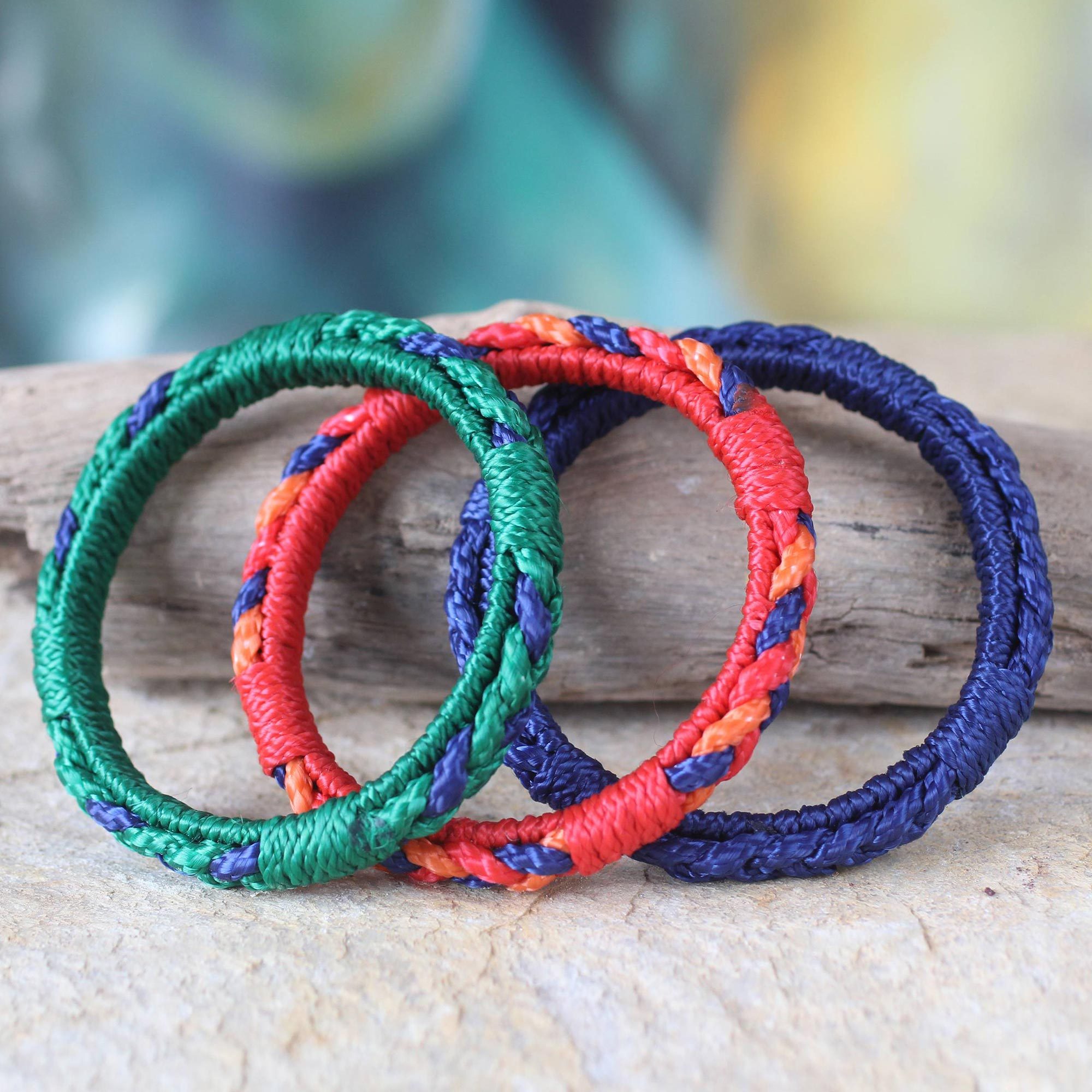The legendary weaving techniques of the Akan people inspire the design of these bracelets. Robert Aidoo-Taylor crafts each bangle with recycled plastic, covering each one with tightly braided motifs in rich shades of blue, green, and red.