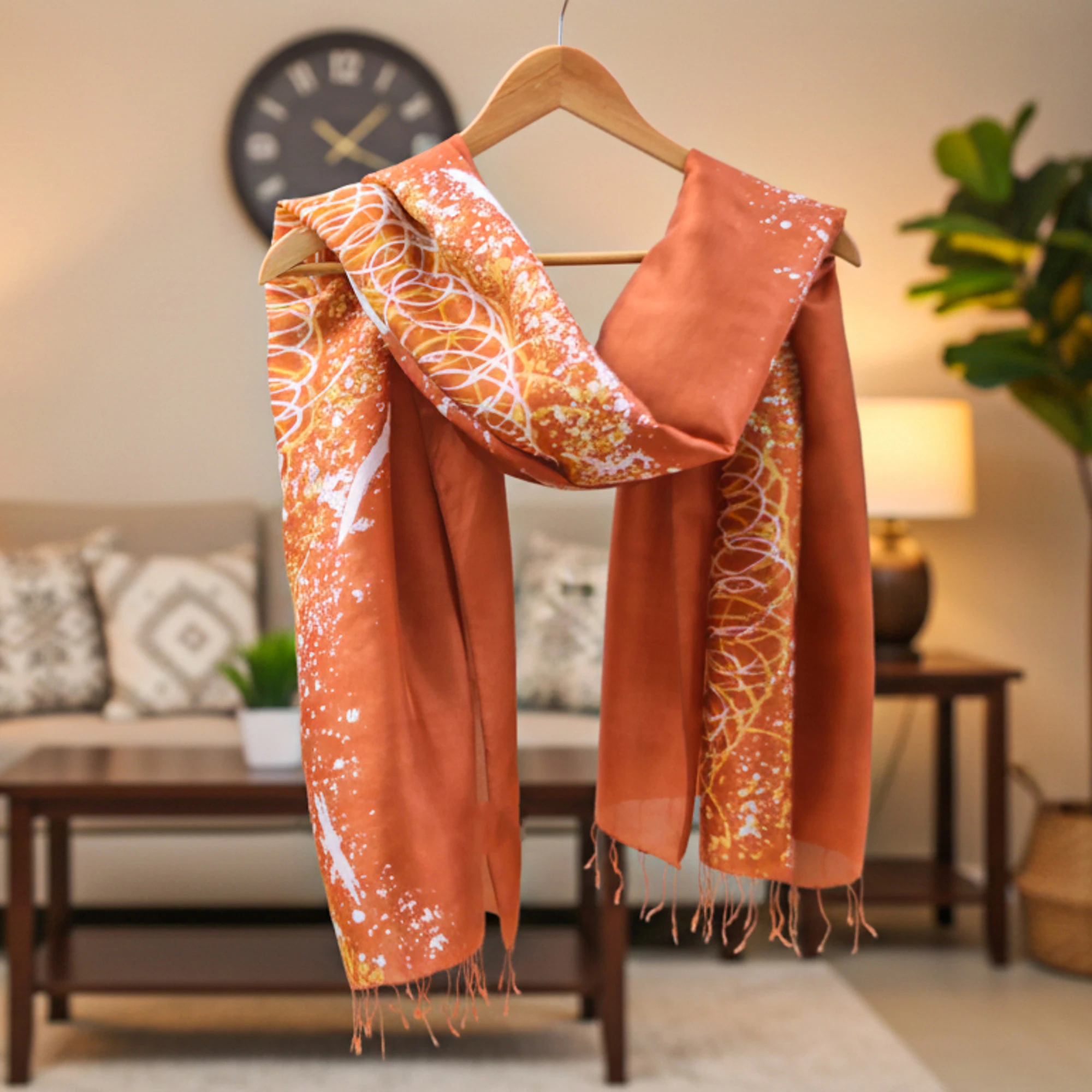 Drawn by hand on luxurious silk, yellow and white lights explode in a pattern of dazzling fireworks. Vinita creates this beautifully modern shawl with batik motifs on a rich, coppery brown.