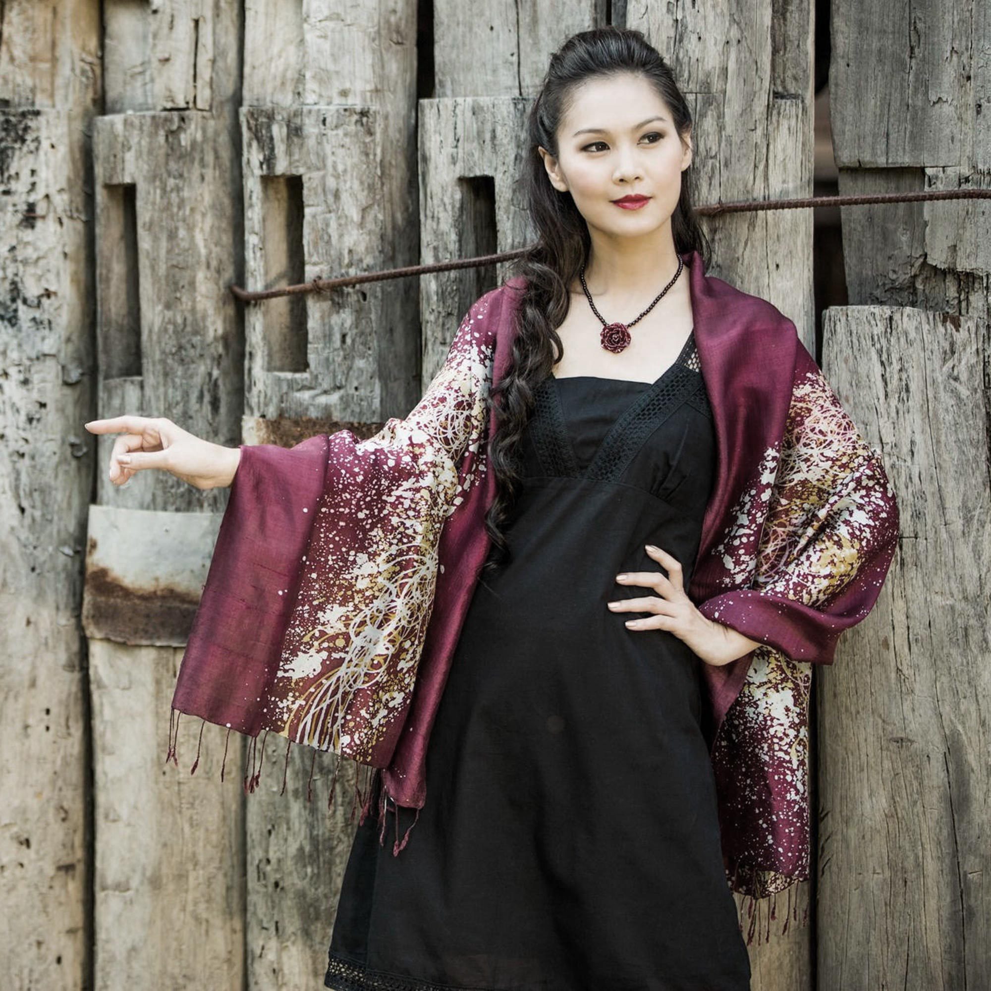 Unique Burgundy Silk Shawl with Batik Design from Thailand, 'Brilliant Batik on Burgundy'