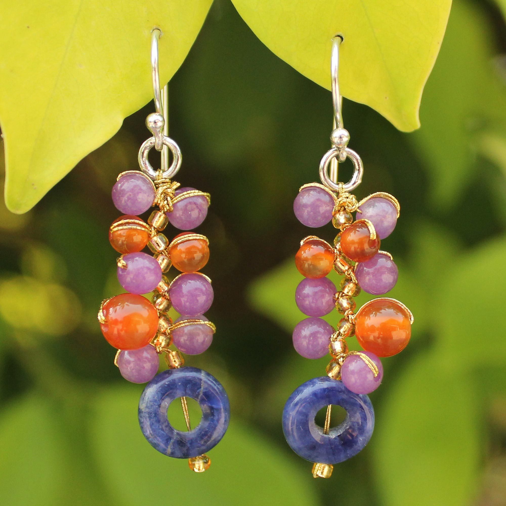 Beautiful in their radiance, gemstones cluster in exquisite earrings. Nareerat knots carnelian and sodalite on silken strands with colorful quartz and glass beads. They hang from silver wires.
