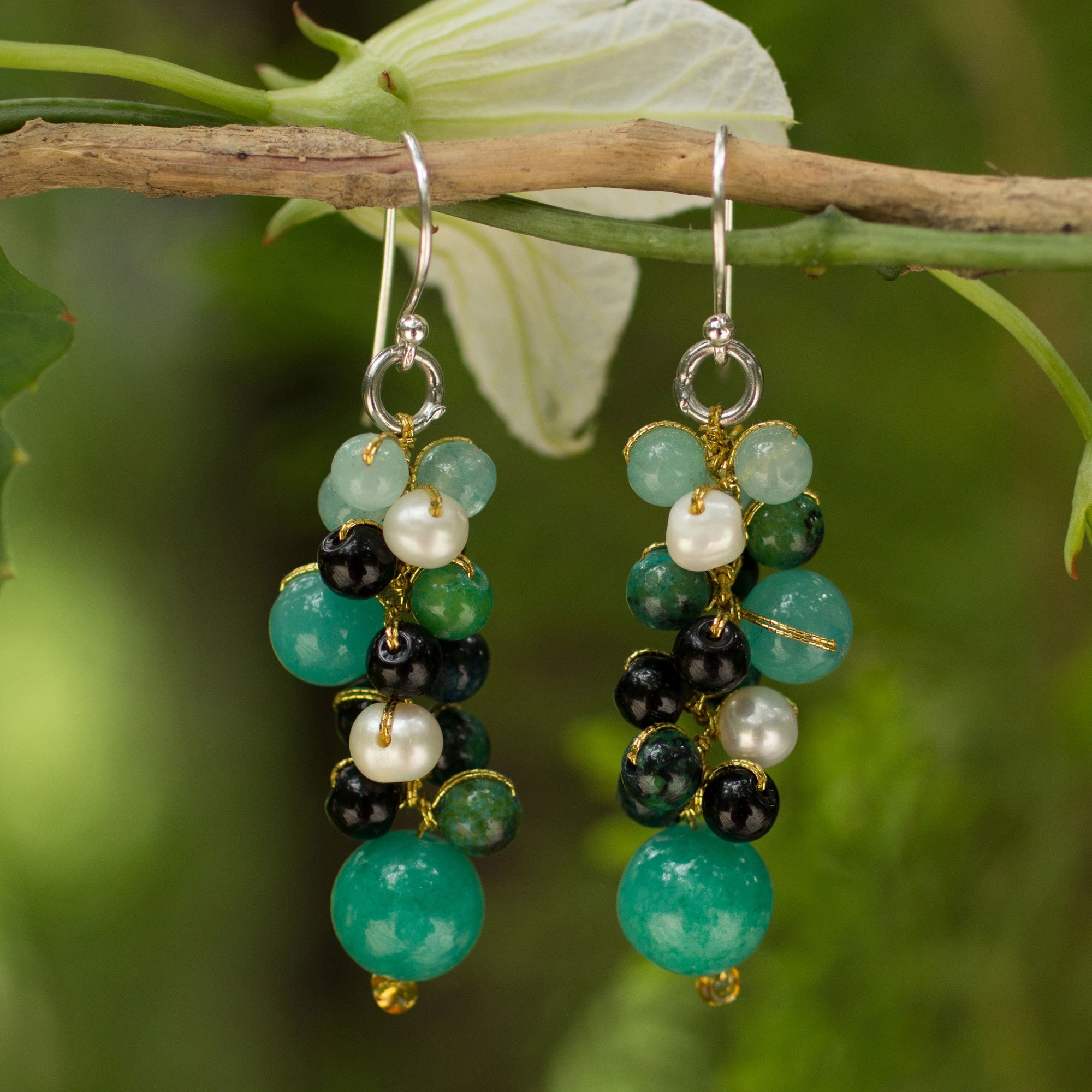 Like the flower buds of Thailand's ki lek tree, green agate, pearls, and quartz cluster in lush profusion to form these wonderful drop earrings. Handcrafted by Nareerat from Thailand, the gems are knotted on golden threads and fastened to sterling silver hooks. Beautiful, fresh, and organic, these earrings will enhance your style by day and night in any season of the year.
