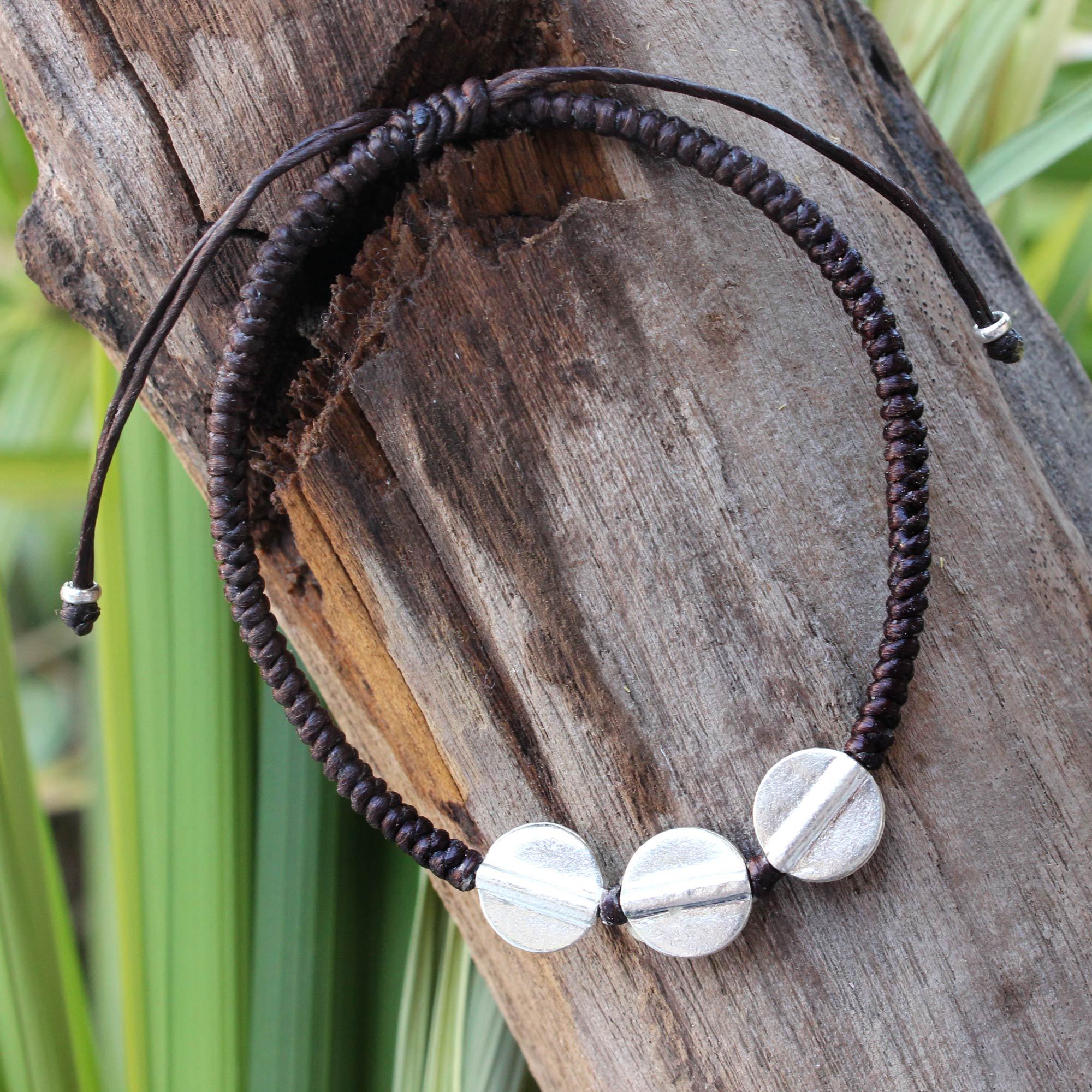 By Napapat in Thailand, this enchanting bracelet is braided by hand. Three circular silver discs, crafted by artisans of the Karen hill tribe, center the design. The length can be adjusted by sliding the knot along the cords.