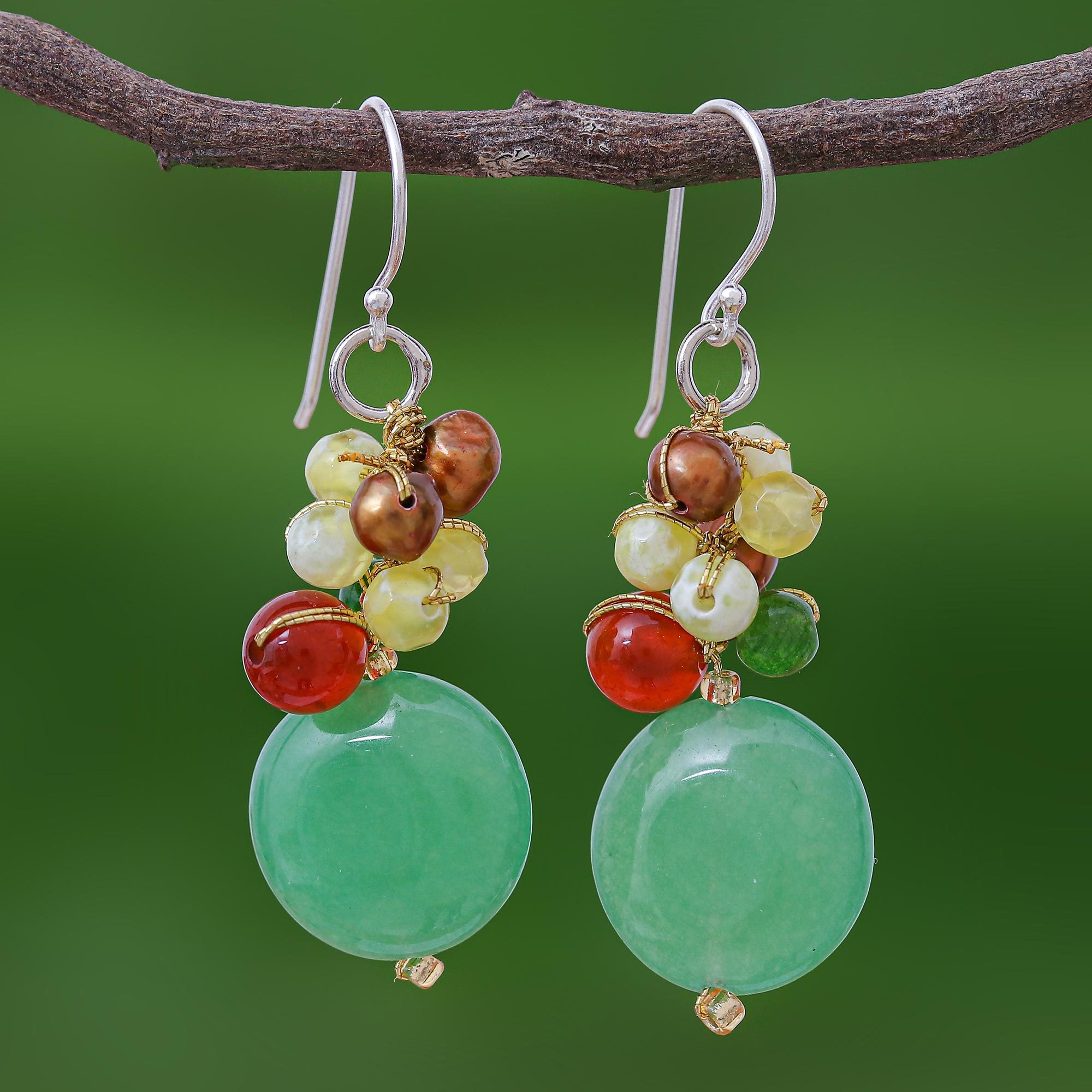 Hanging from sterling silver hooks, the talented artisan hand-knots colorful gemstones on silken threads. By Nareerat from Thailand, this joyful pair of earrings combines luminous pearls, complex yellow and green quartz and vibrant carnelian. Radiant and cheerful, this dazzling piece adds a dynamic element to attire.