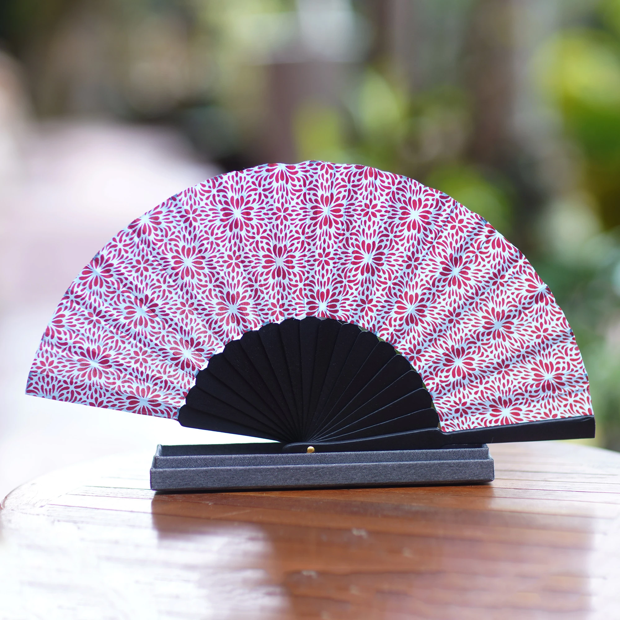 This elegant pinewood and silk batik fan is from Melati's Collection in Bali. The fan is crafted of pure silk in a sky blue shade, with an all-over aster print in crimson. The fan arrives in a linen-covered gift box.