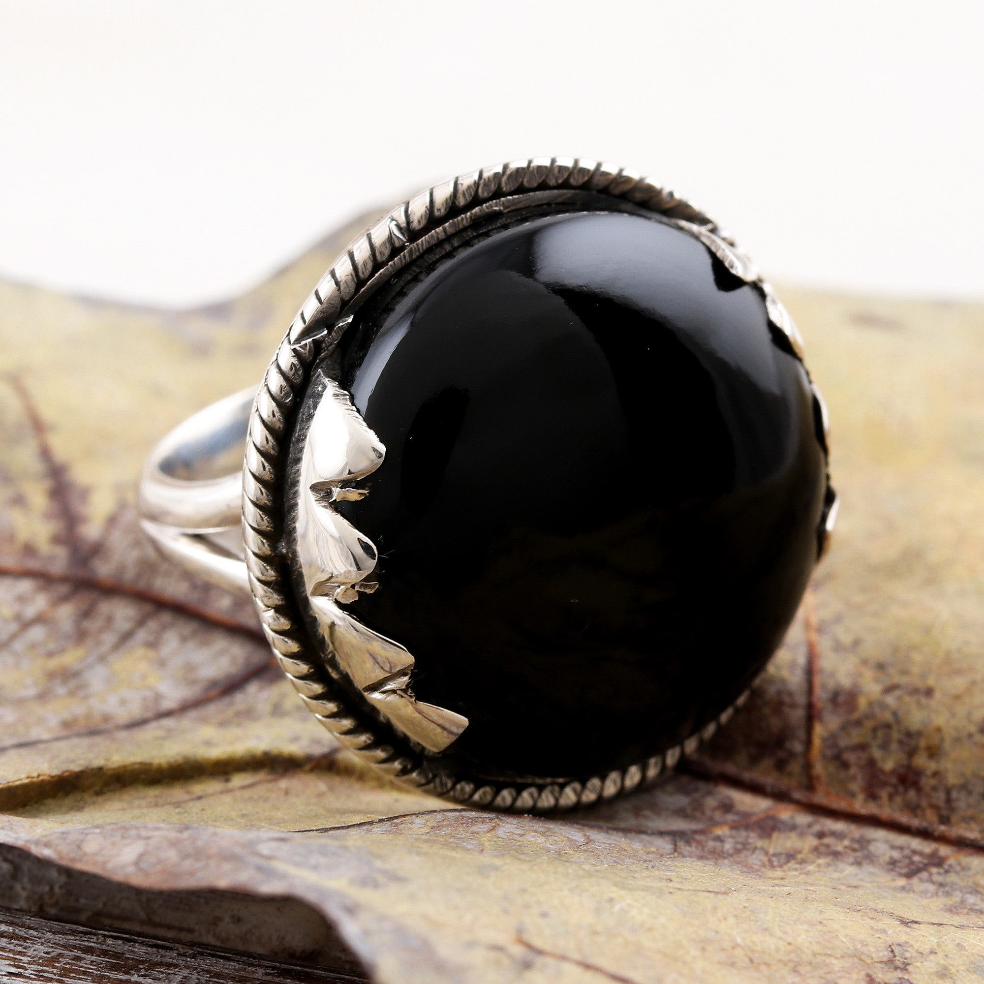 This unique cocktail ring is designed by Rakesh Rana in India. A sleek cabochon of black onyx is set in sterling silver that is shaped on both sides to resemble a jagged mountain range. The mountain peaks rise above a rope-edged bezel.