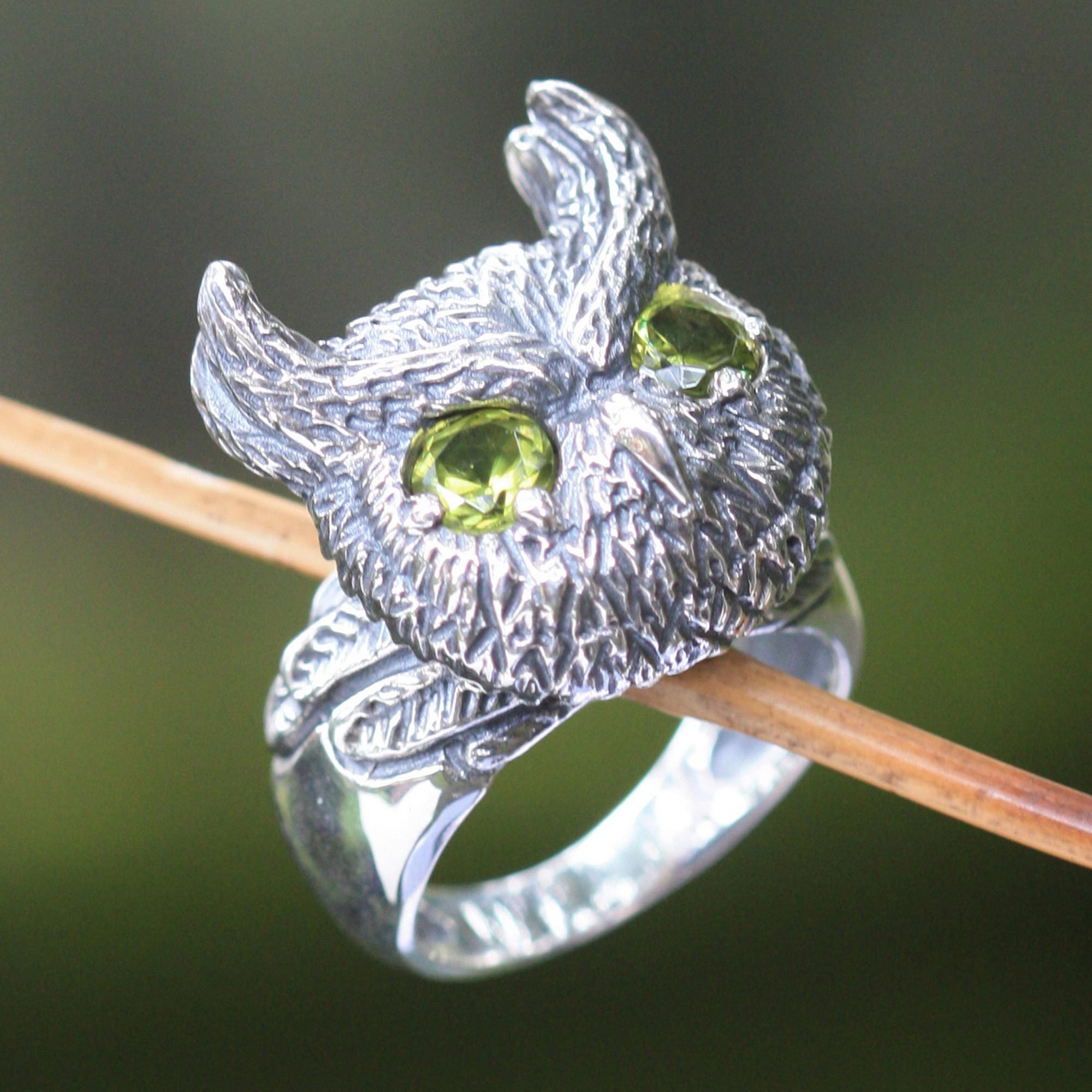 A spectacular horned owl turns jeweled eyes upon the nocturnal mysteries of life in this fabulous, original ring. Designed by Jenny Setiawan from Indonesia, handcrafted sterling silver combines with sparking faceted peridot to celebrate the wisdom, mystical vision, and spiritual connection of the owl. Meticulously detailed and expressive, this wonderful ring is a perfect accent for the woman of spirit and style.