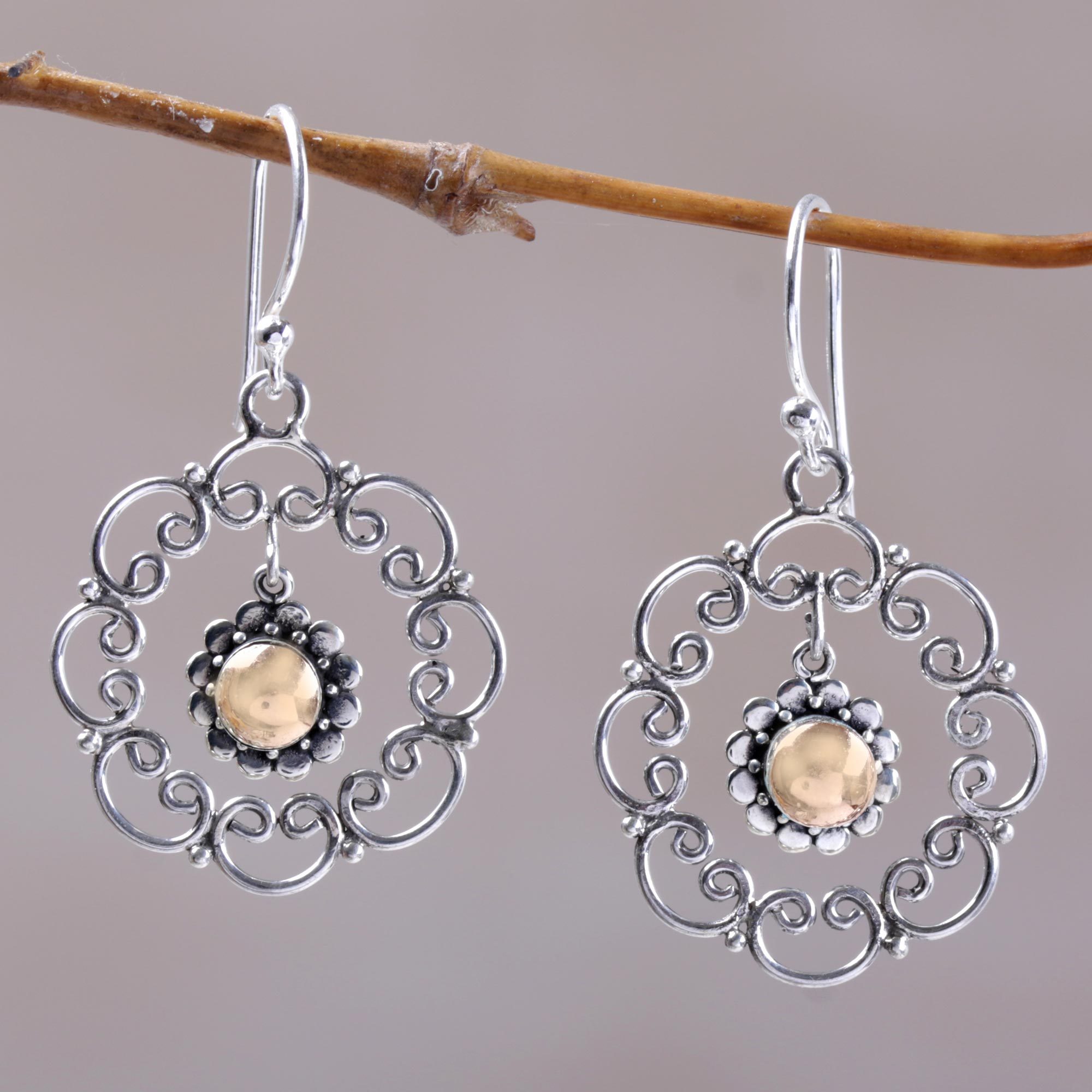 Diah Arini captures feminine beauty in these soft and elegant dangles. Scrolling detail in sterling silver and a hanging golden pistil create a stunning floral design. 18k gold plate accents the centers. These earrings are sure to be a gorgeous addition to your jewelry collection.