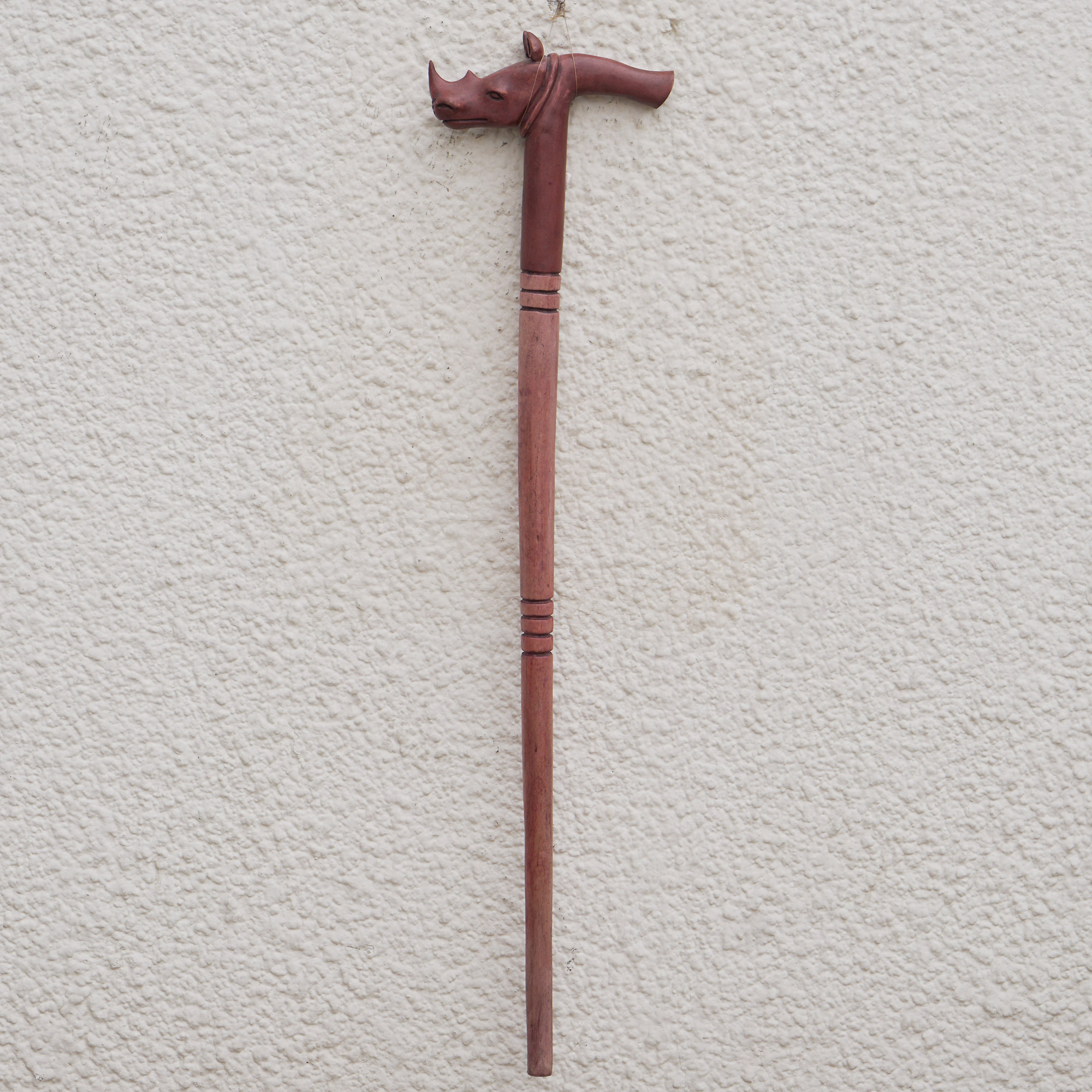 Securely armored, the rhinoceros brandishes his singular horn like a sword. So large and powerful are these animals they must give way only to the elephant, however, their greatest threat has been from man. An endangered species in Africa, the beast graces a distinguished walking stick by George Obeng.