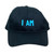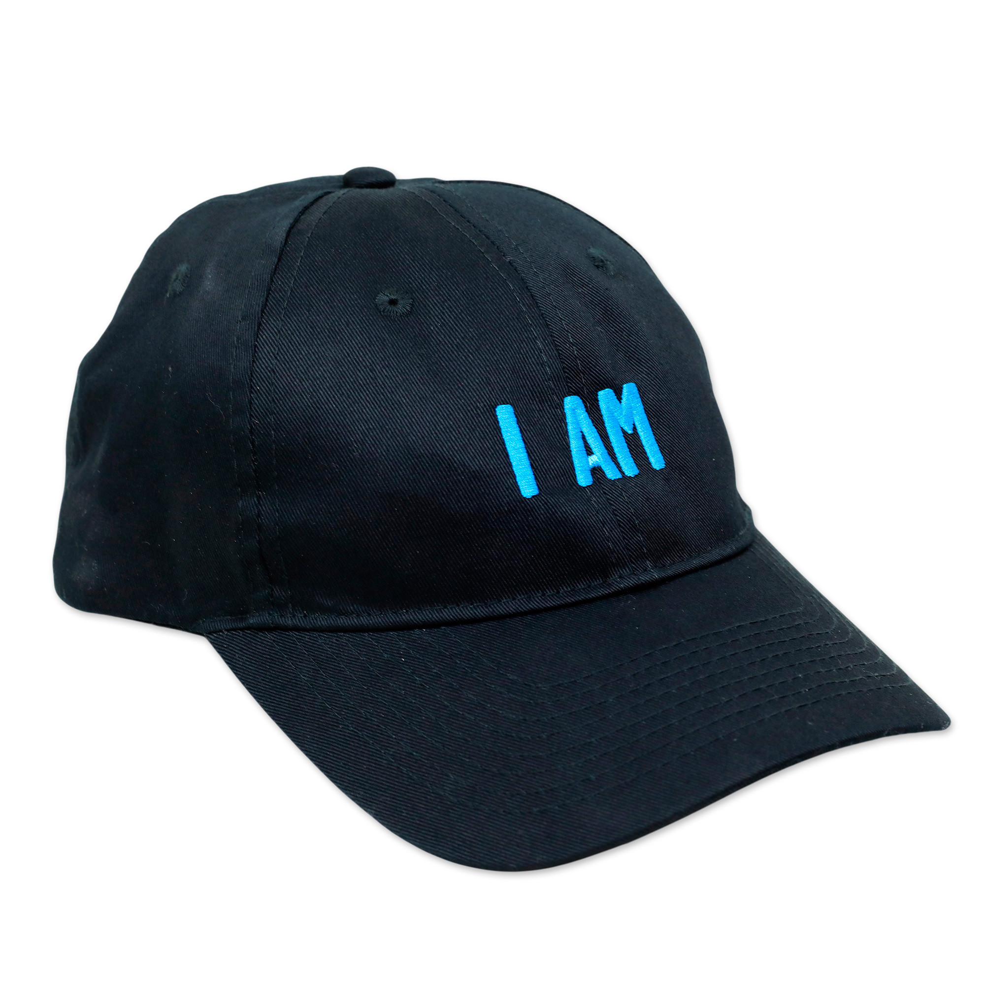 This unstructured black cotton 6-panel hat features UNICEF's cyan 'I AM' embroidered on the front and 'UNICEF USA' embroidered on the back.