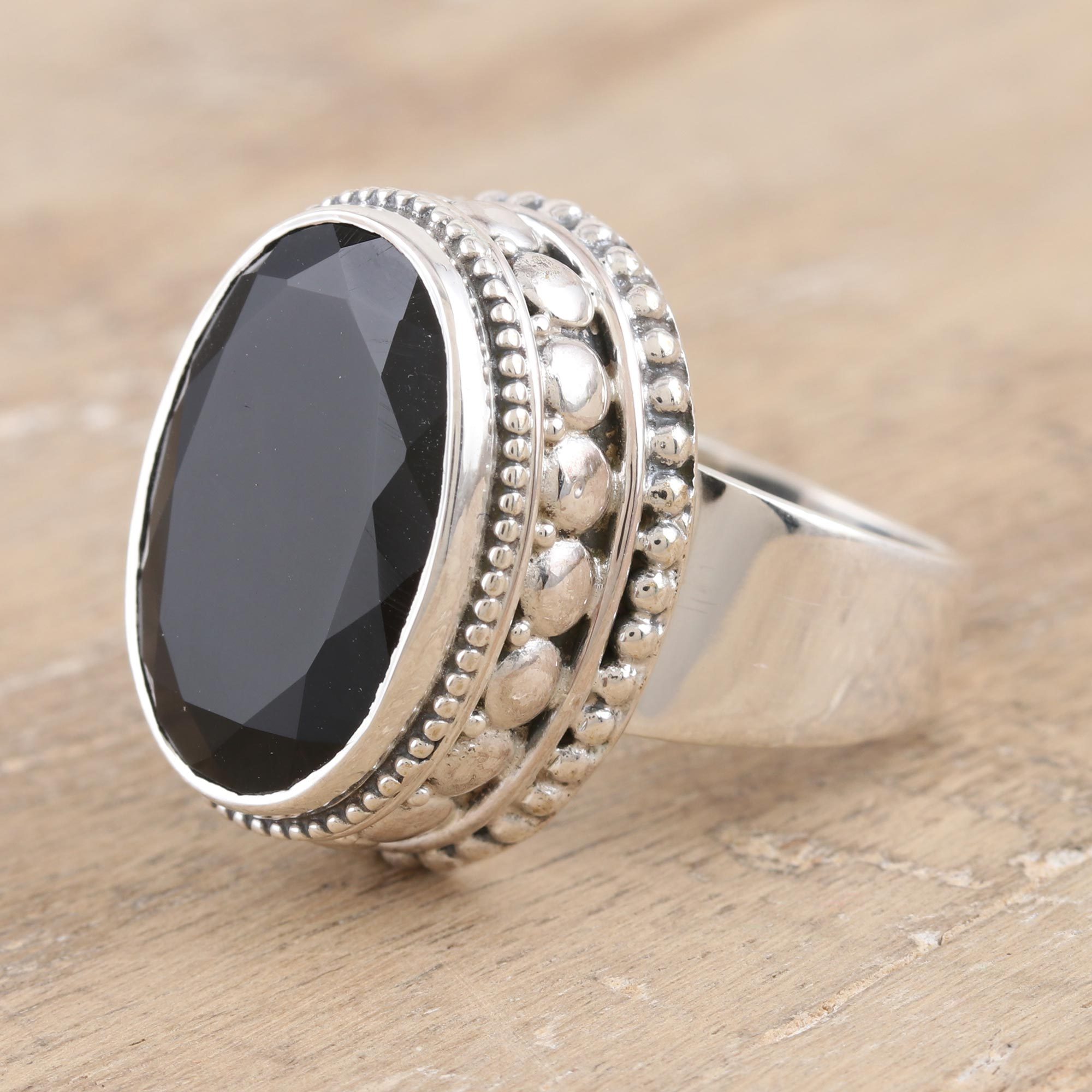 A faceted black gemstone catches the light on Chintan's unisex ring, surrounded by a shimmering silver dot motif. The Indian artisan centers the cocktail ring with a large onyx gem in a bezel setting, hand crafting the band from polished sterling.