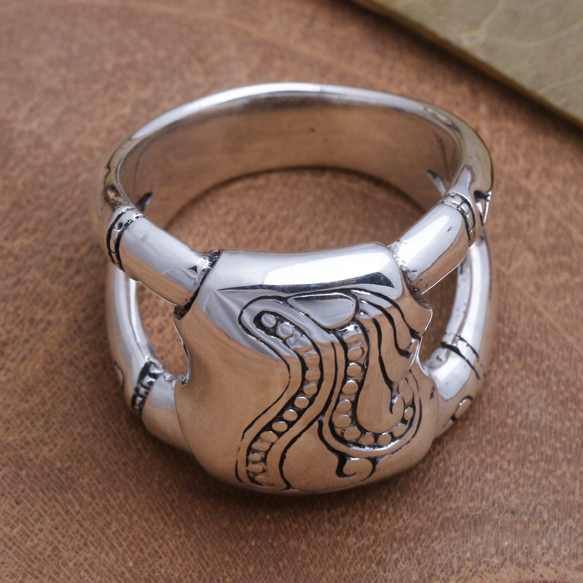 Dewa Arimbawa in Bali designs a unique ring with bamboo-like motifs on the crown and band. The substantial ring is crafted of sterling silver with a combination finish.
