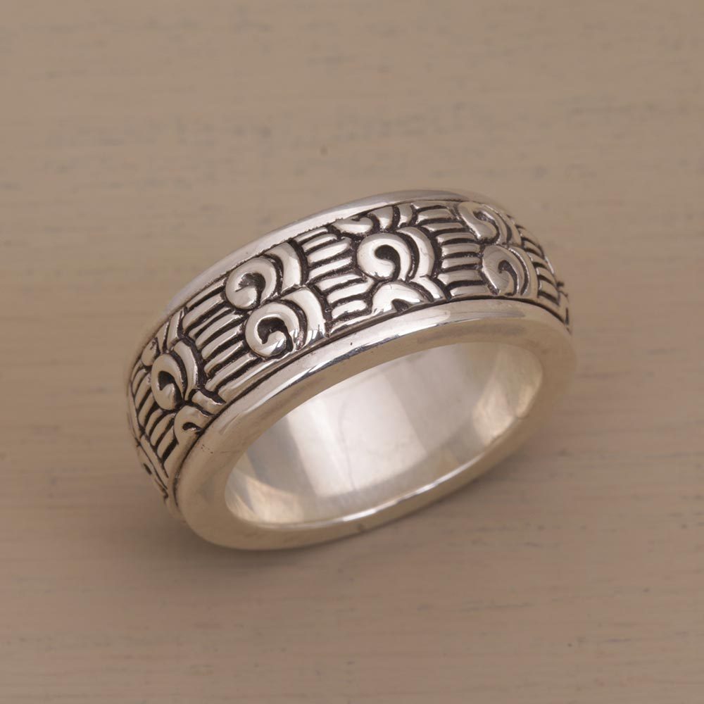 Bali artisan Nyoman Ariawan crafts a meditation ring that is rich with cultural interest. The unisex sterling silver band ring is adorned with curling samsi motifs. A kind of Buddhist motif popular in China, samsi designs are often found on the lion statues that stand guard in Buddhist temples. The decorated center portion of the meditation ring spins freely on the band.