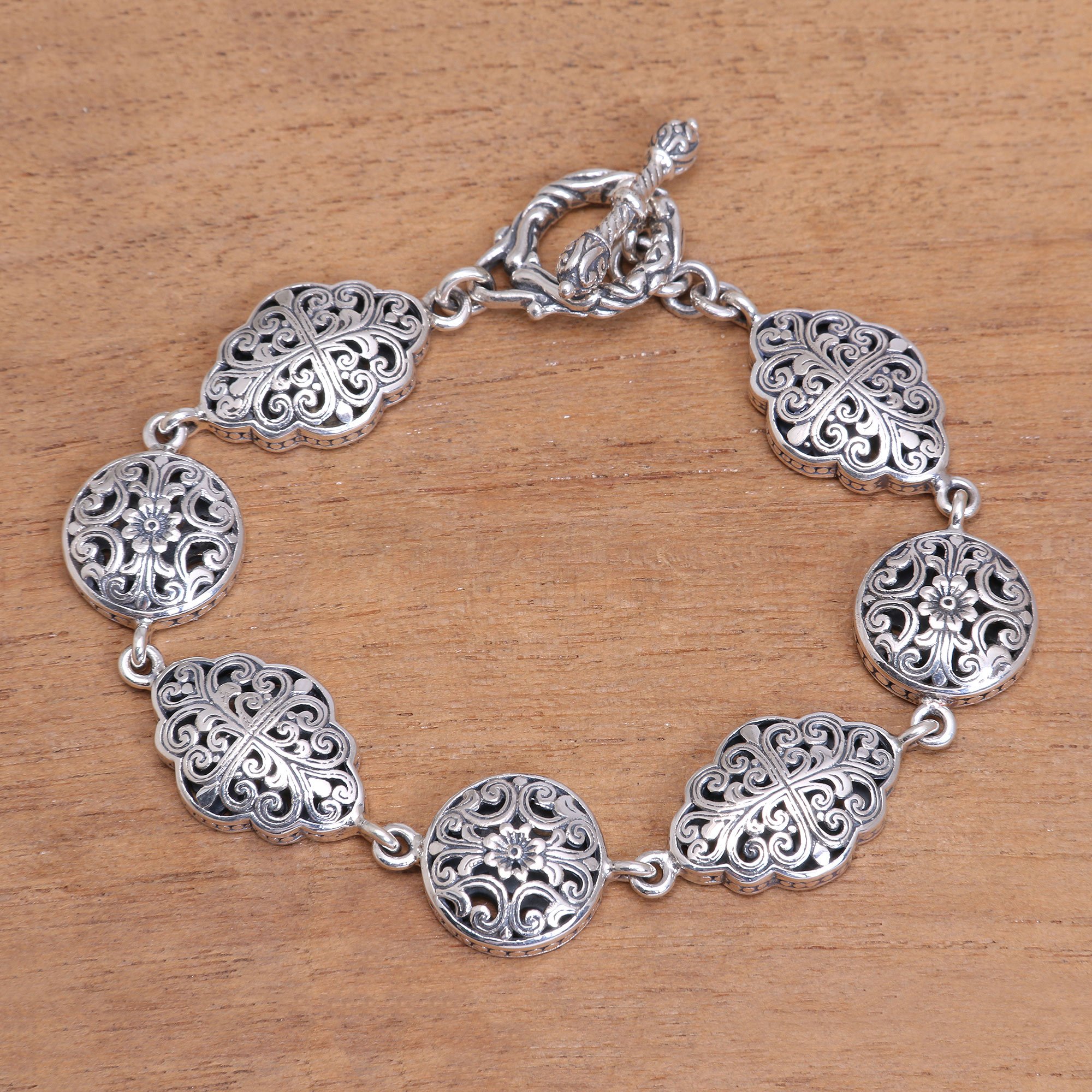 Inspired by the beauty of the gardens in Ubud, Bali, this link bracelet features openwork floral vine patterns that decorate its sterling silver links. Ni Wayan Astiti creates this bracelet, featuring a combination of finishes that accentuates the openwork. Round floral links alternate with diamond-shaped vine links.