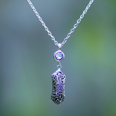 An enchanting amethyst stone graces this sterling silver pendant necklace, a testament to artisan Ekayani's craftsmanship. The design artfully blends traditional Balinese motifs with a modern touch, creating a striking visual contrast between bright and oxidized silver surfaces that truly distinguishes this must-have accessory.
