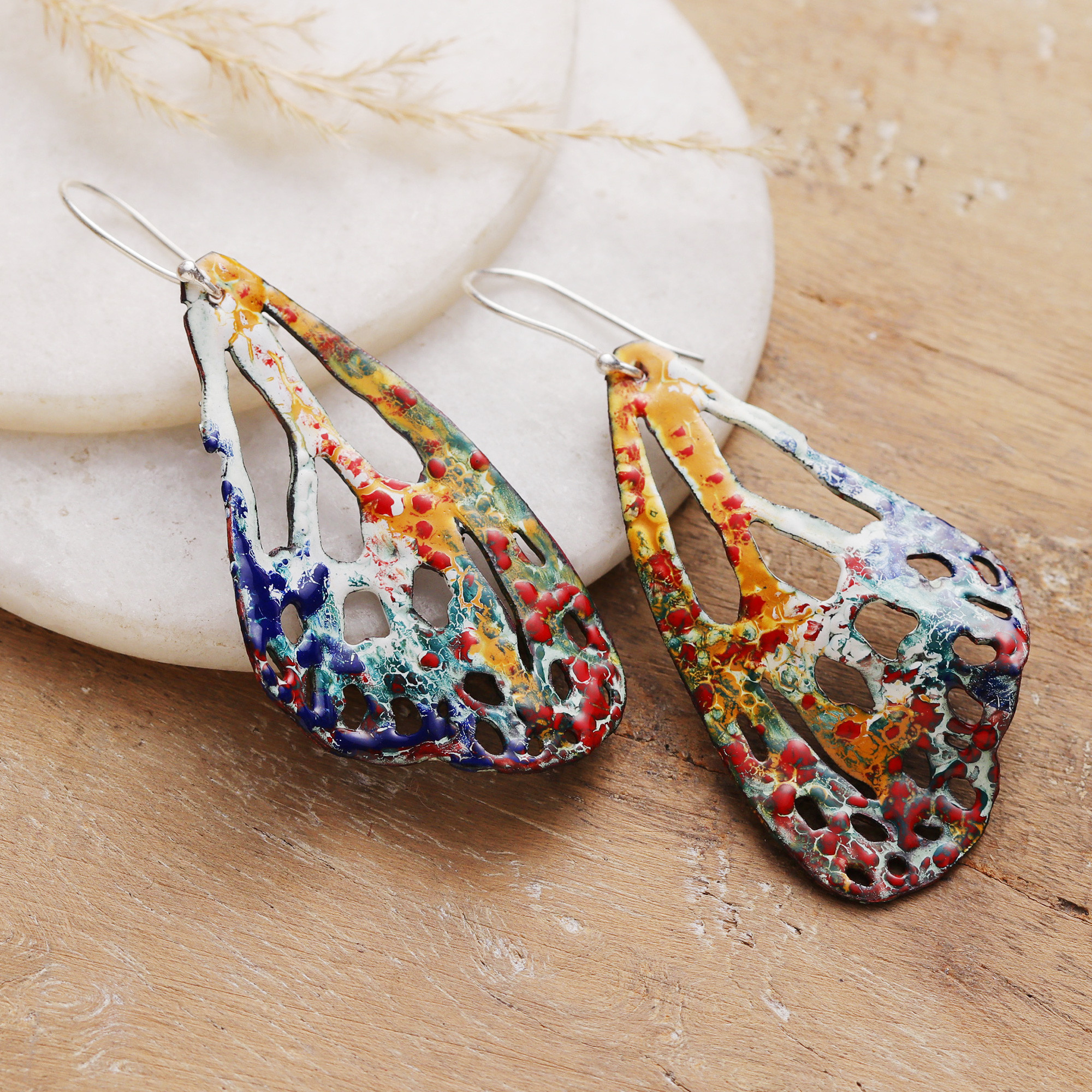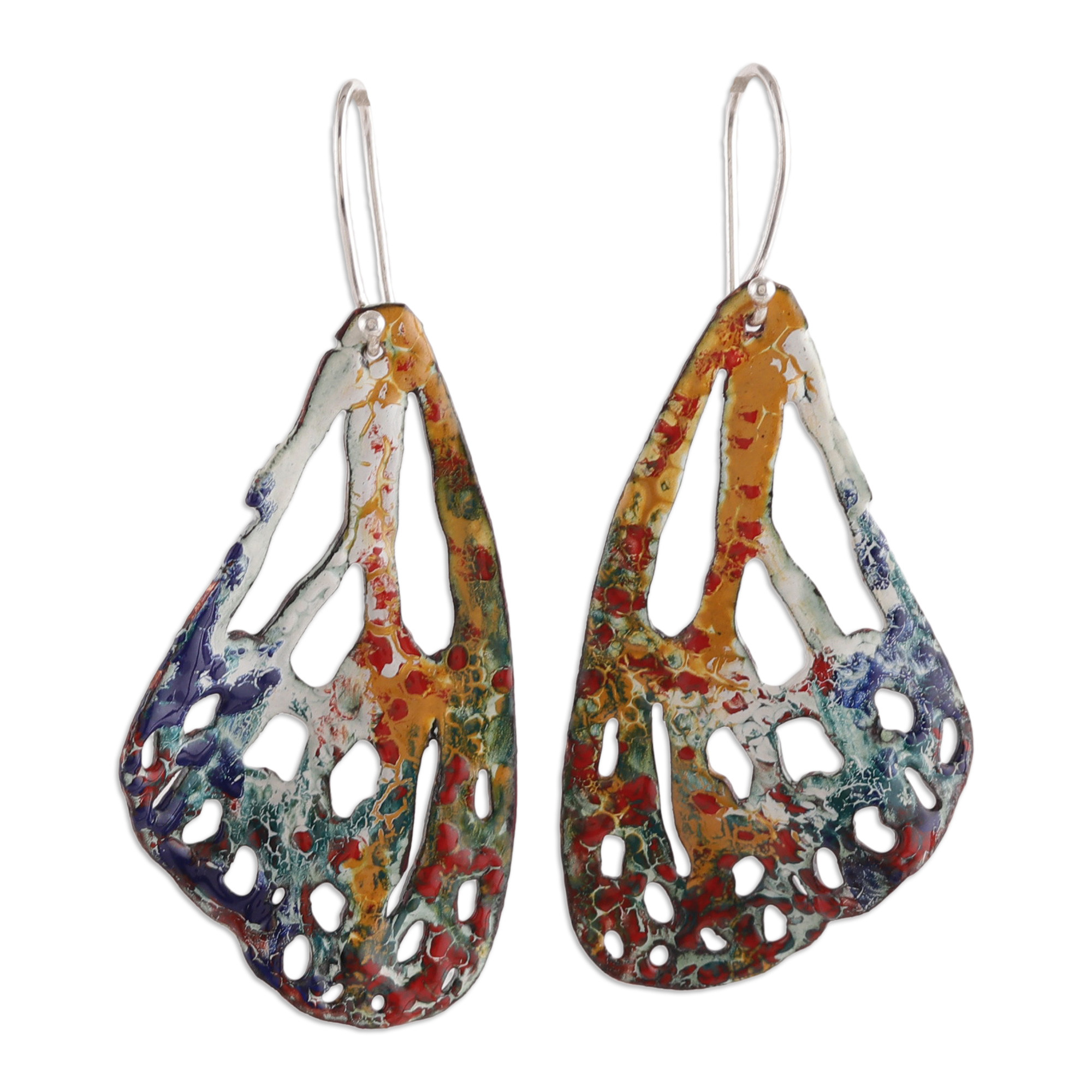 Unleash your inner fashionista with these show-stopping dangle earrings inspired by the delicate beauty of butterfly wings. The gorgeous accessories boast intricate openwork accents and a stunning array of colors thanks to the masterful application of vitreous enamel on copper. Designed by India's Kavita, these eye-catching earrings are finished with glossy shine and lustrous sterling silver hooks.