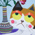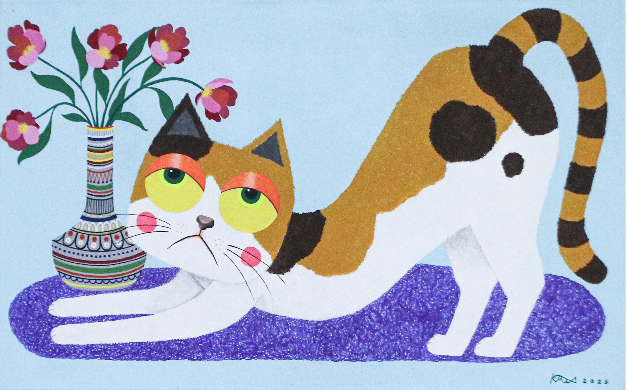Whimsical Cat-Themed Naif-Themed Acrylic on Canvas Painting, 'Morning Stretch in Bloom'