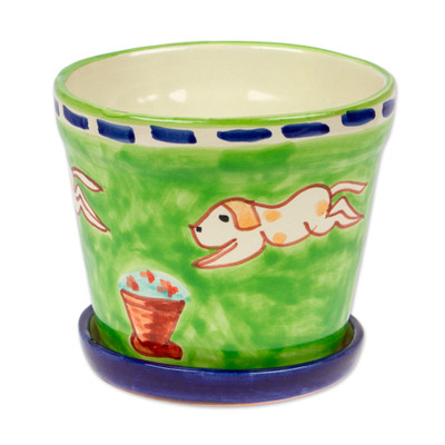 Childhood memories return, as green as a primaveral garden. Ivan Martinez of Mexico crafts this sweet flower pot from ceramic and classic techniques. Then, Ivan paints the piece in green and blue hues, giving life to a whimsical dog-themed composition. Practical and ready to add a naïve touch, the pot has a hole for drainage and a matching saucer.